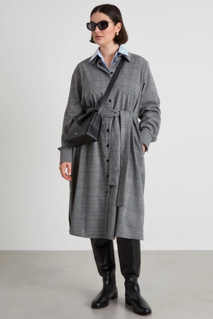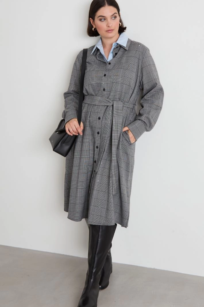 Straight-fit shirt dress in stretch viscose blend yarn-dyed fabric, with tone-on-tone embroidered micro sequins, classic collar, long sleeves with cuff and button, and side slits. Full-length button fastening and matching sash.