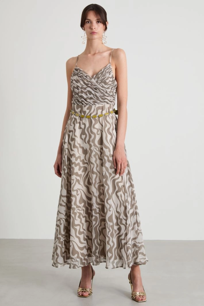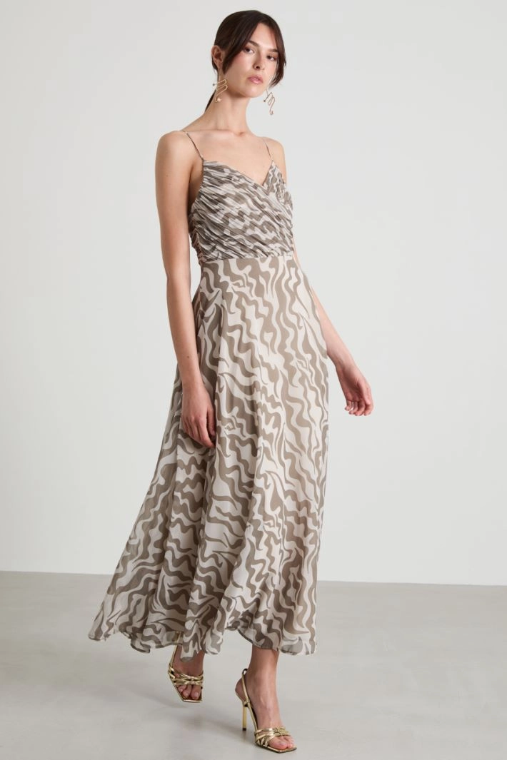 Loose-fitting dress in printed georgette, with a V-neck, pleated bodice and thin shoulder straps. Invisible zip fastening at the centre back. Lined.