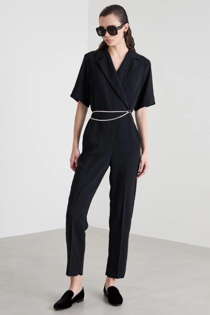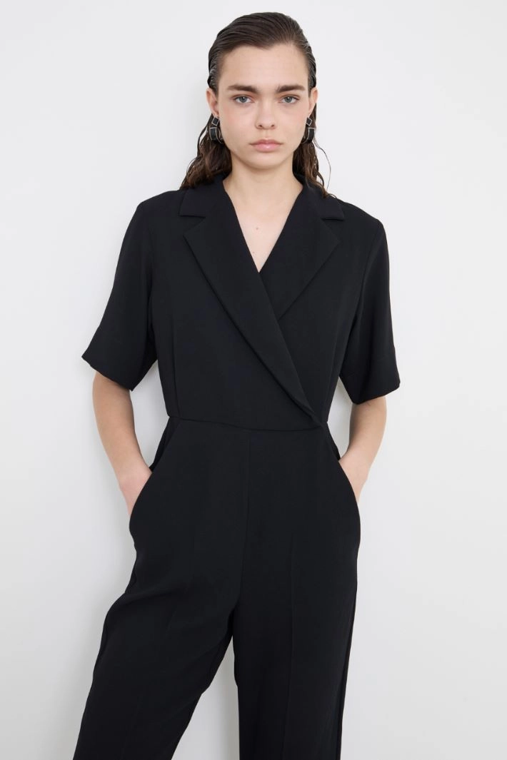 Long envers satin jumpsuit with lapel collar, short sleeves, side French pockets, single welt pocket on the back and hidden cross fastening with button and hook. Semi-lined garment.