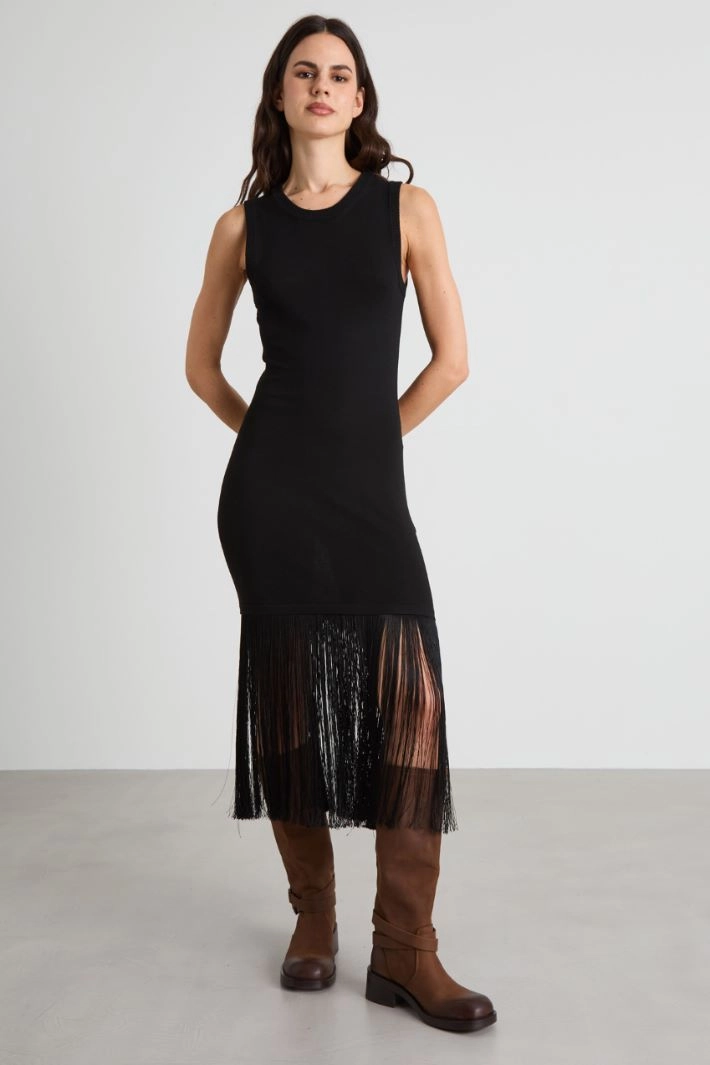 Fitted dress in viscose blend jersey, with round neckline, sleeveless and fringed motif at the hem.