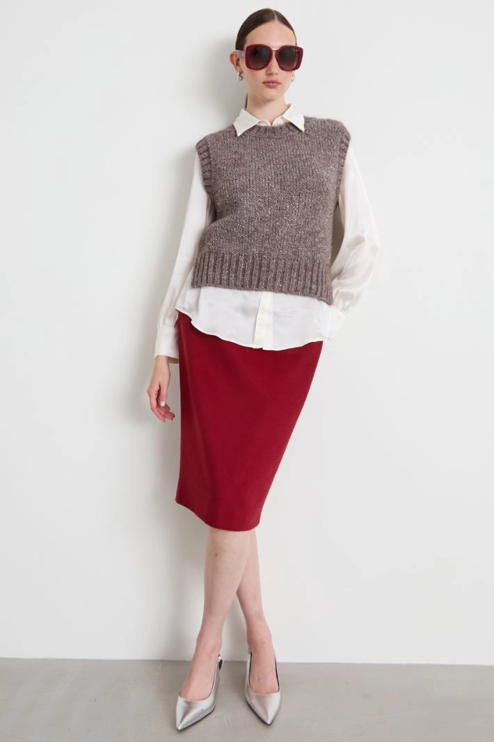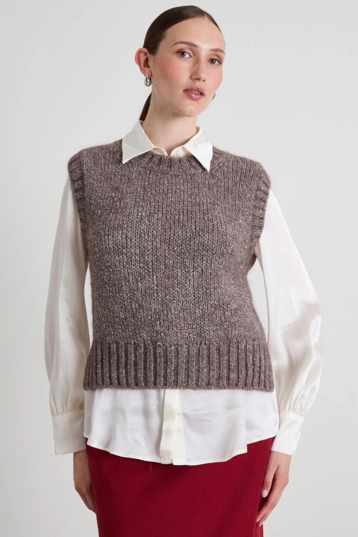 Straight-cut gilet in yarn with micro sequins, crew neck, side slits at the hem and ribbed trim.