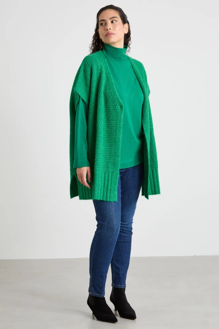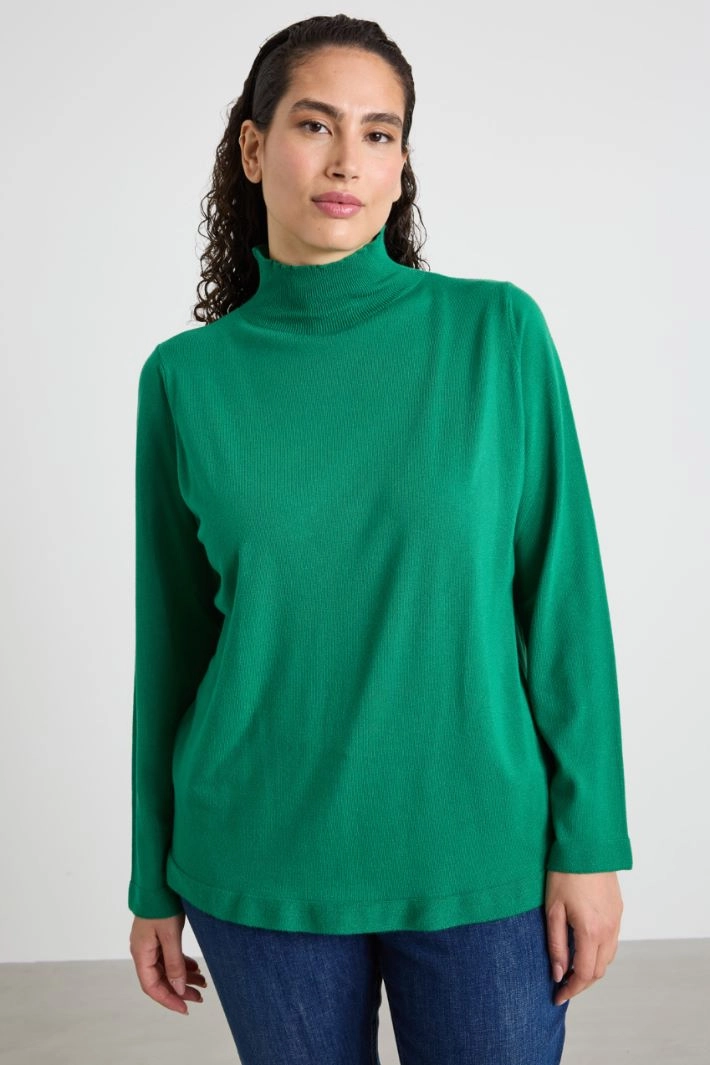 Straight-cut sweater in stretch viscose blend yarn, with high neck and long sleeves.