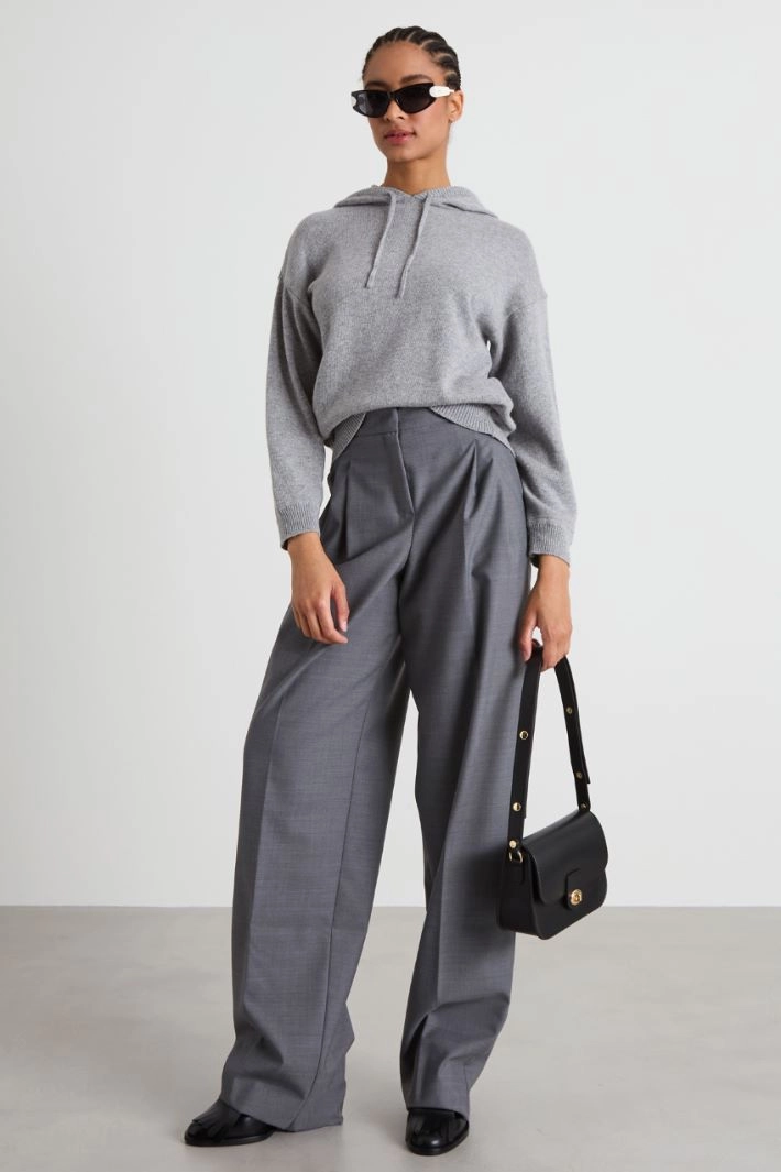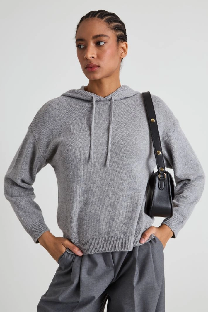 Straight-cut sweater in wool and viscose blend, with hood and drawstring, long dropped sleeves and ribbed edges.