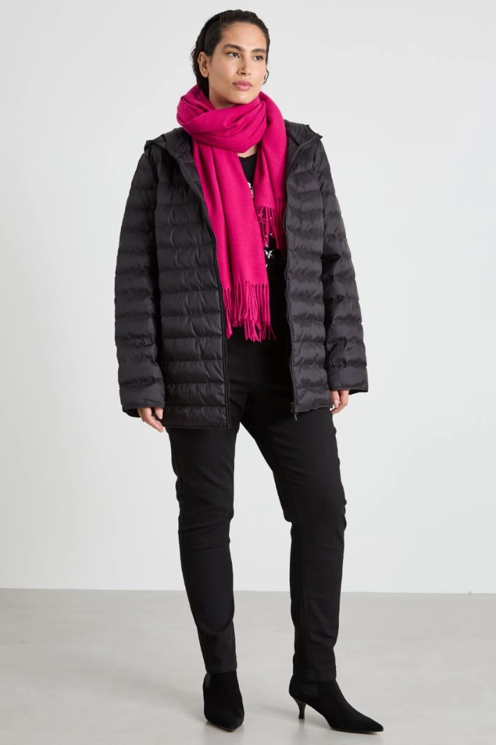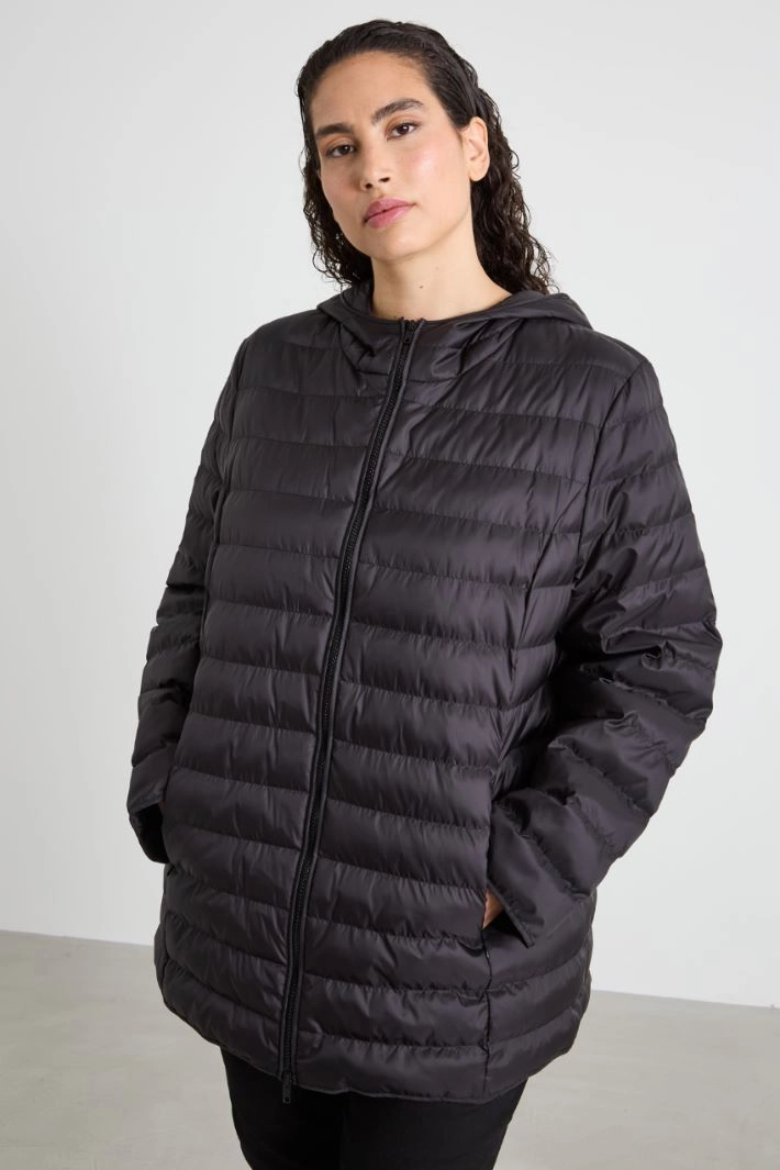 Padded jacket in technical satin, with a hood, long sleeves and inset side pockets with zip. Fastening with a double slider zip.