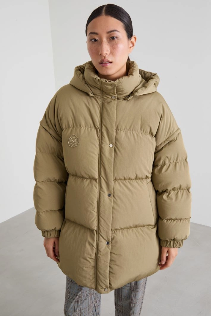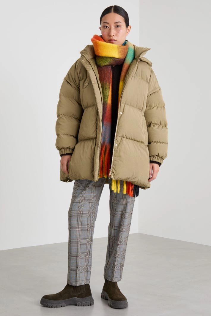 Loose-fit down jacket in technical fabric, with hood, removable long sleeves with elastic insert at the wrist, side welt pockets and fastening with hidden double-slider zip and press studs.