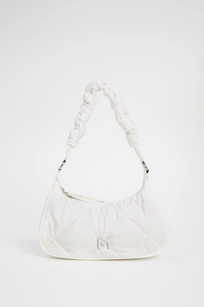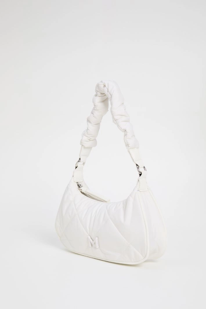 Padded shoulder bag in technical satin with a quilted pattern, with a curled handle, an adjustable and removable shoulder strap, and a zip closure. Lined interior with a pocket.
