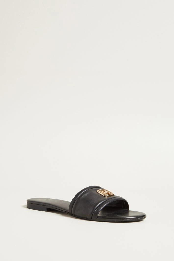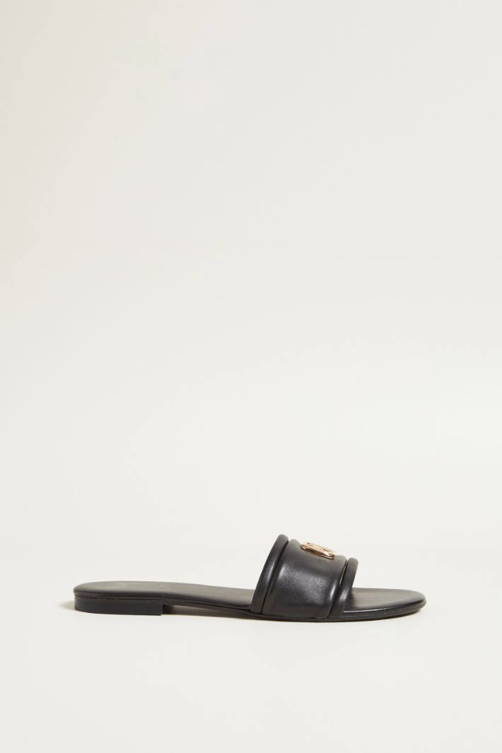 Slippers in genuine leather with a smooth texture, with application on the upper, band and thin straps in tone. Leather lining, rubber sole.