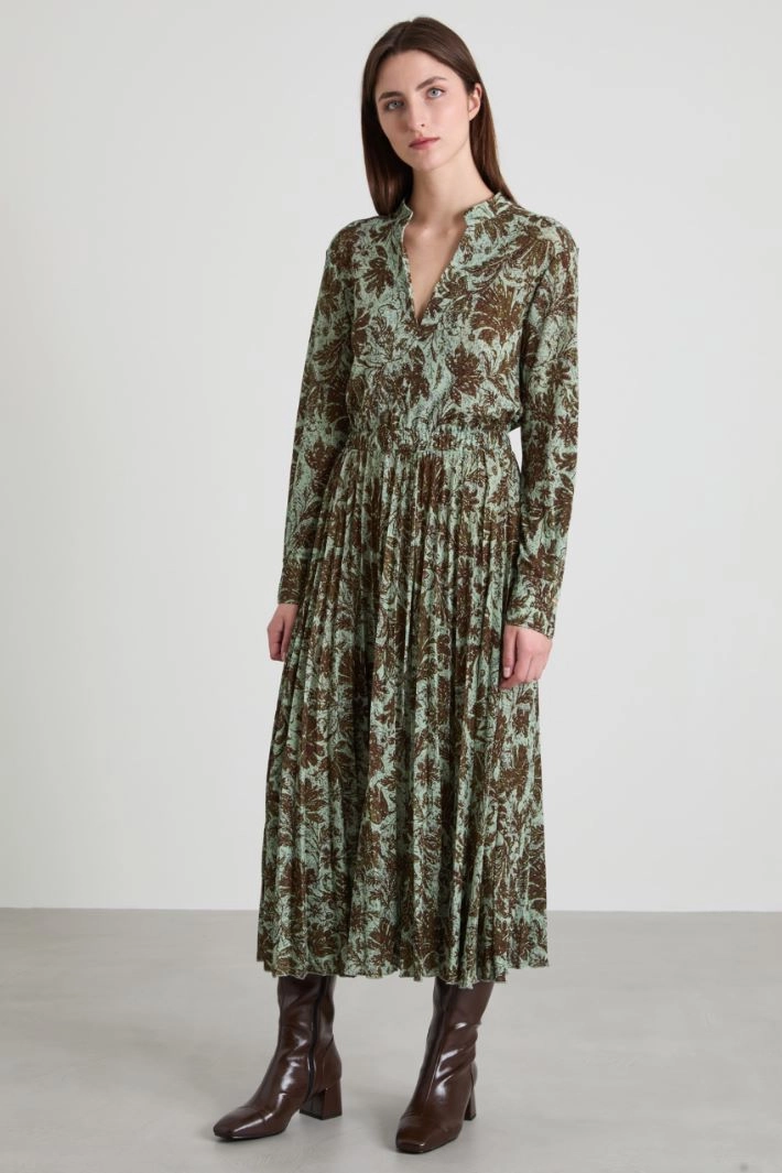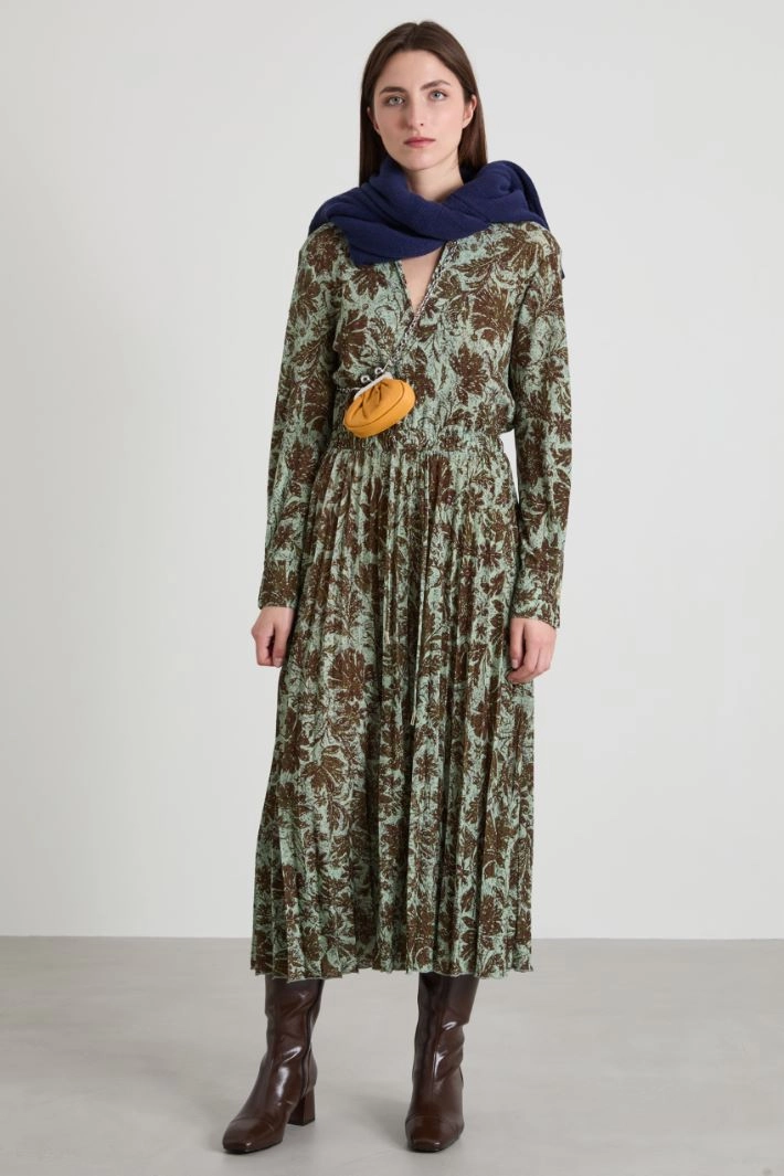Slightly flared dress in crepe jersey, with round neckline finished with a V-shaped opening, long sleeves with cuffs and button, drawstring waist and pleated detail on the skirt.