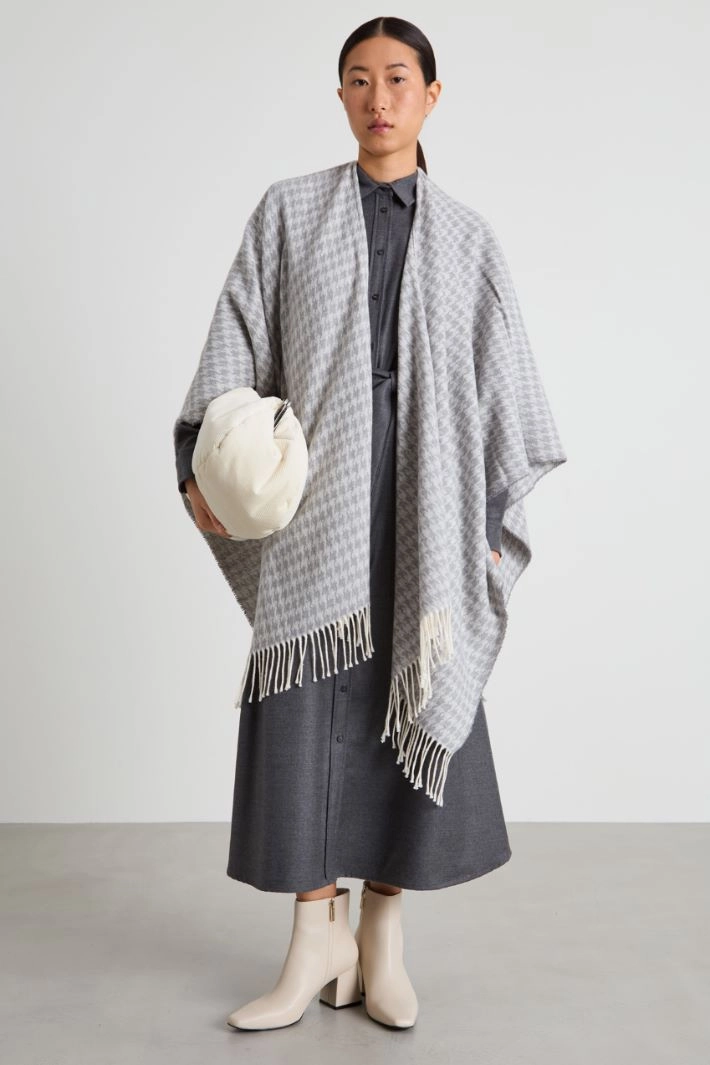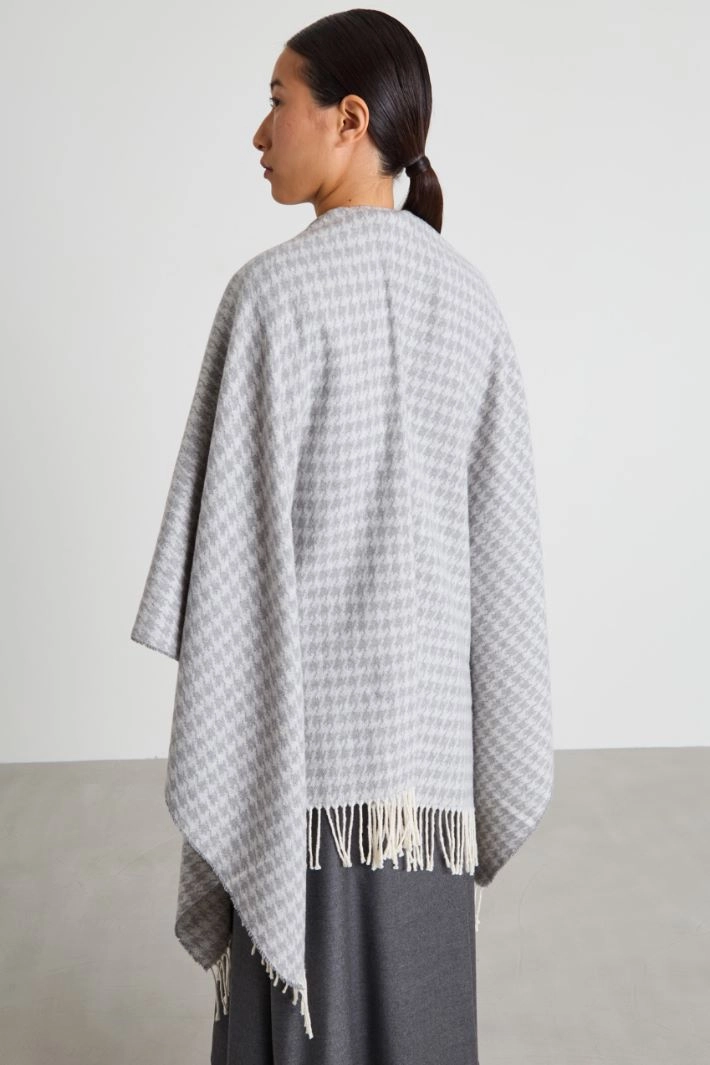 Poncho in yarn-dyed cotton blend fabric, with fringe pattern at the bottom.