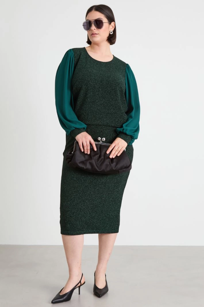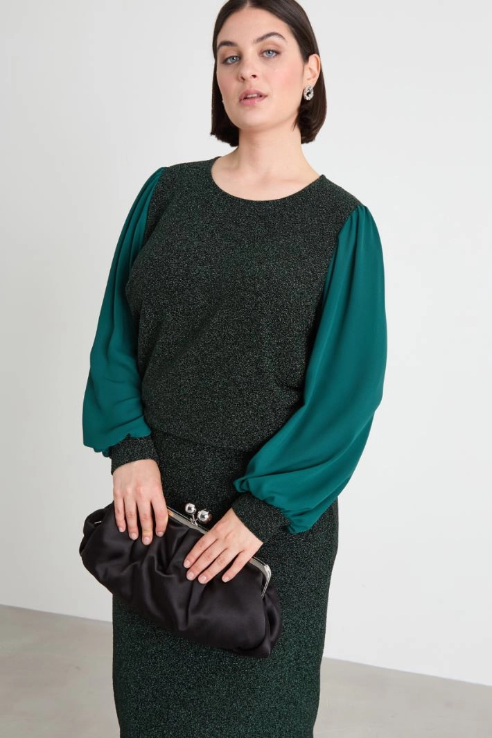 Straight-cut sweater in lamé jersey, with a crew neck and long gathered georgette sleeves.