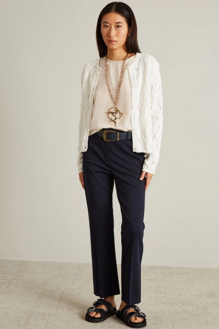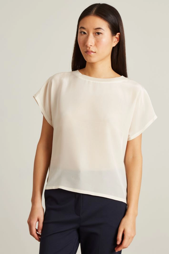 Loose-fit T-shirt in silk and cotton, with round neckline and short sleeves.