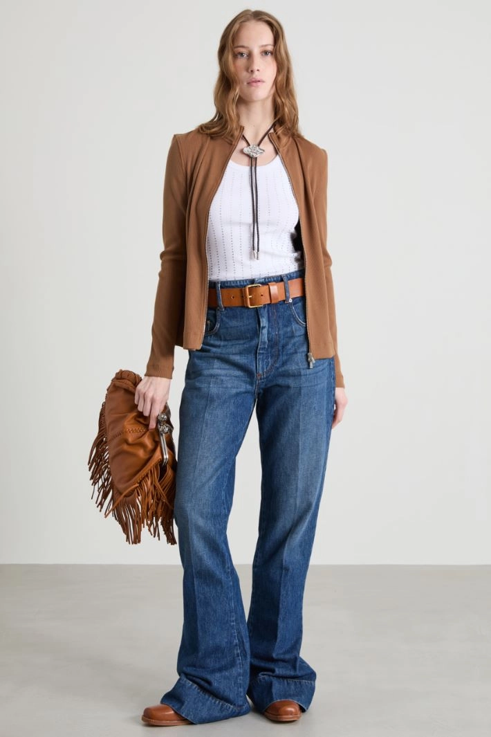 Semi-fitted top i ribbed stretch cotton jersey, with all-over rhinestones and U-neckline.