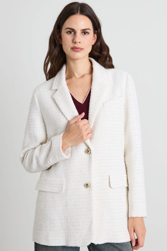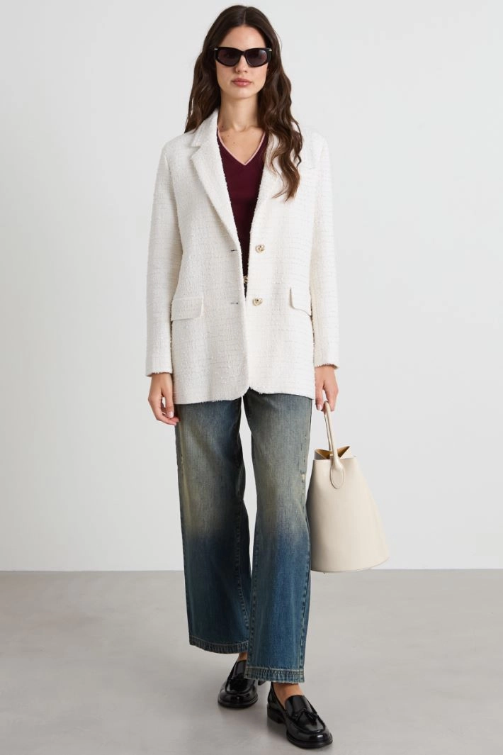 Straight-fit blazer in cotton-blend lamé tweed, with lapel collar, long sleeves, breast pocket and side welt pockets with flap. Central vent on the back and double-breasted fastening with metal buttons. Lined.