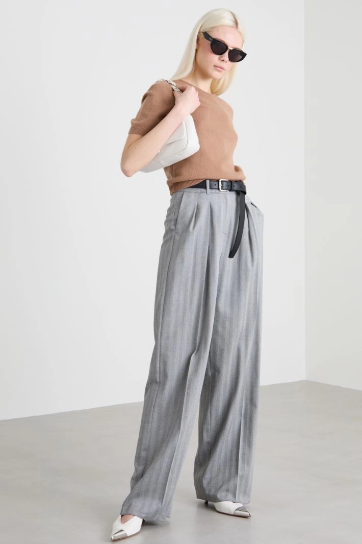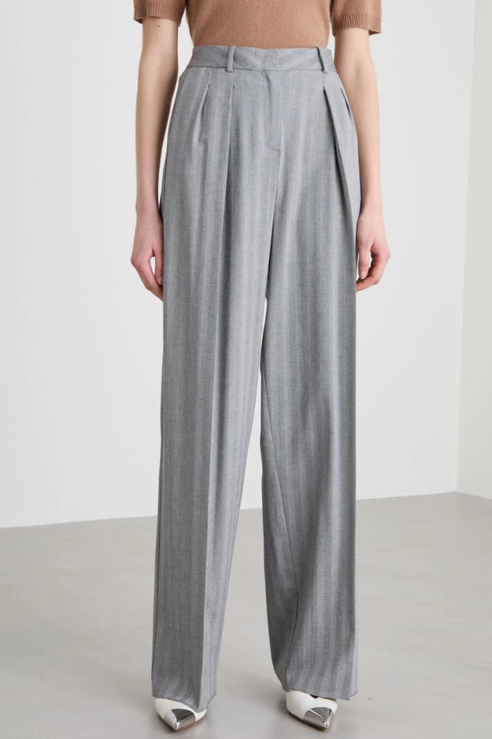 Wide, straight-leg trousers in stretch viscose blend herringbone fabric, with belt loops, pleats, French pockets on the front, double welt pockets on the back, pressed crease. Hidden fastening with zip, button and hook.