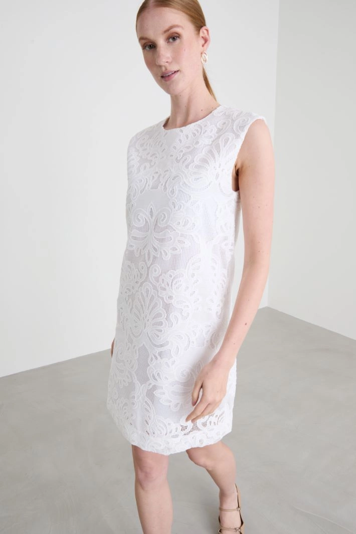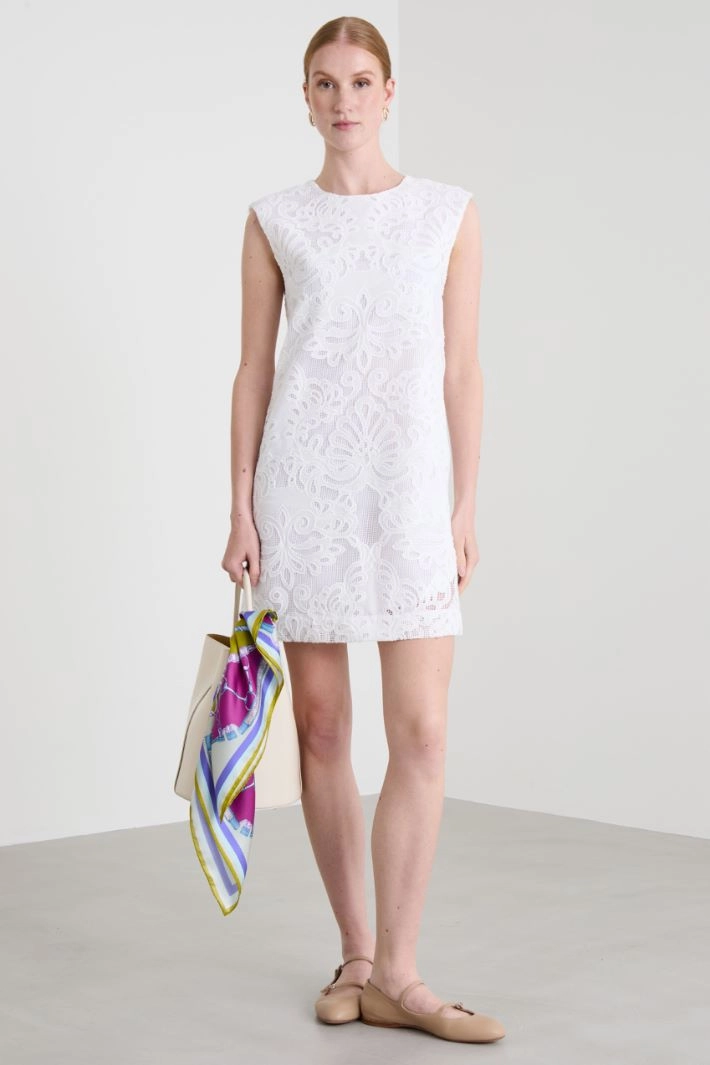 Flared lace dress with round neckline and teardrop fastening with button. Lined.