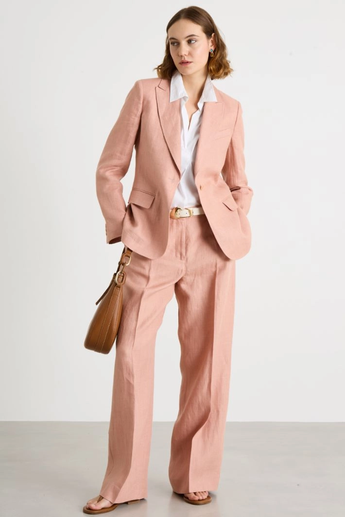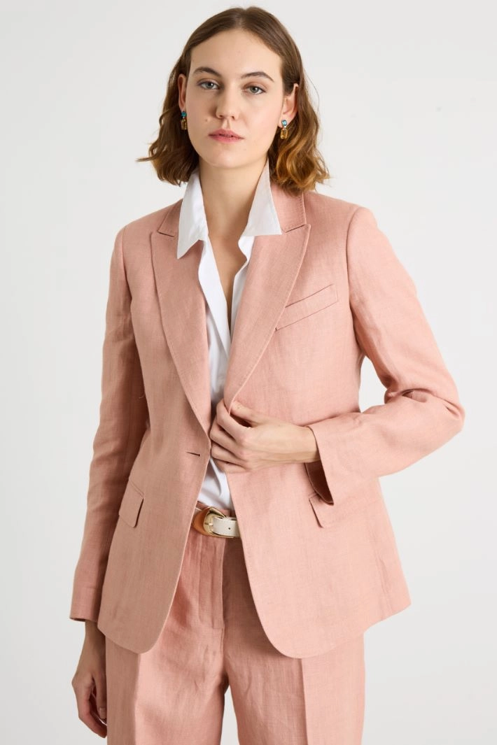 Slightly fitted blazer crafted in pure linen, with a lapel collar, long sleeves with buttoned cuffs, a breast pocket, flap welt pockets and a central vent on the back. Single-button fastening.
