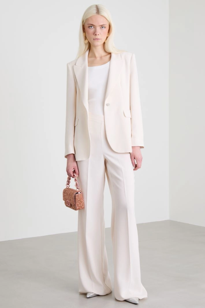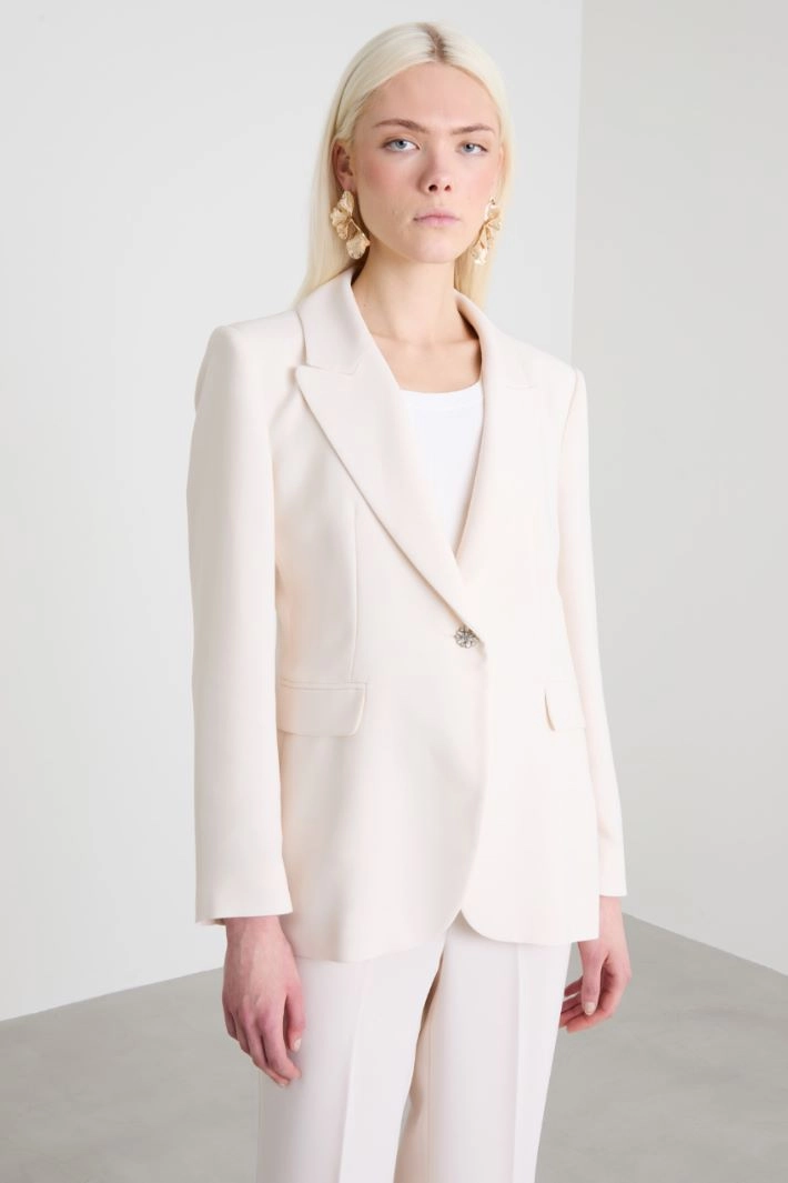 Fitted blazer in crepe envers satin, with peak lapel, long sleeves and flap pockets. Jewel button fastening. Lined.