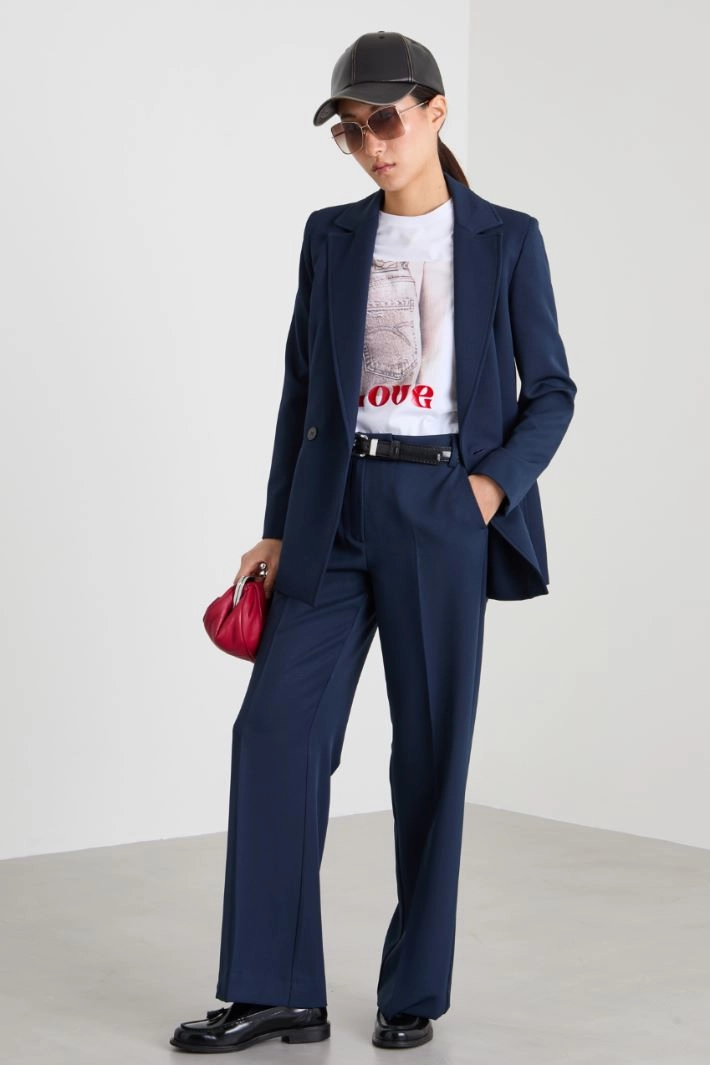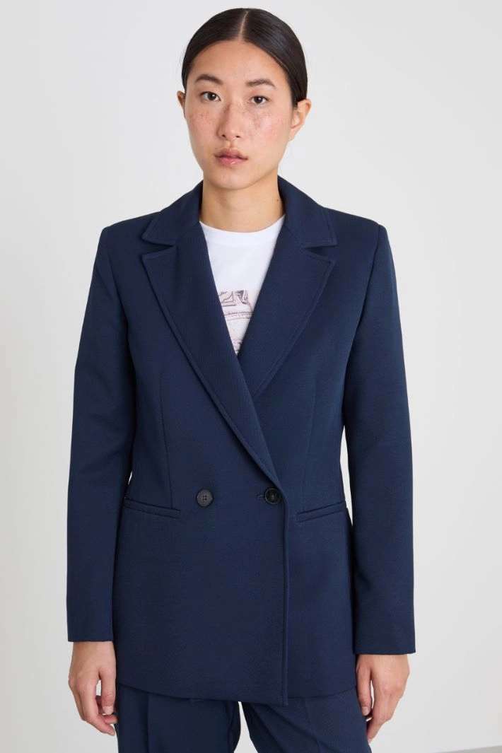 Fitted blazer in stretch twill fabric, with lapel collar, long sleeves and welt pockets. Double-breasted button fastening. Lined.