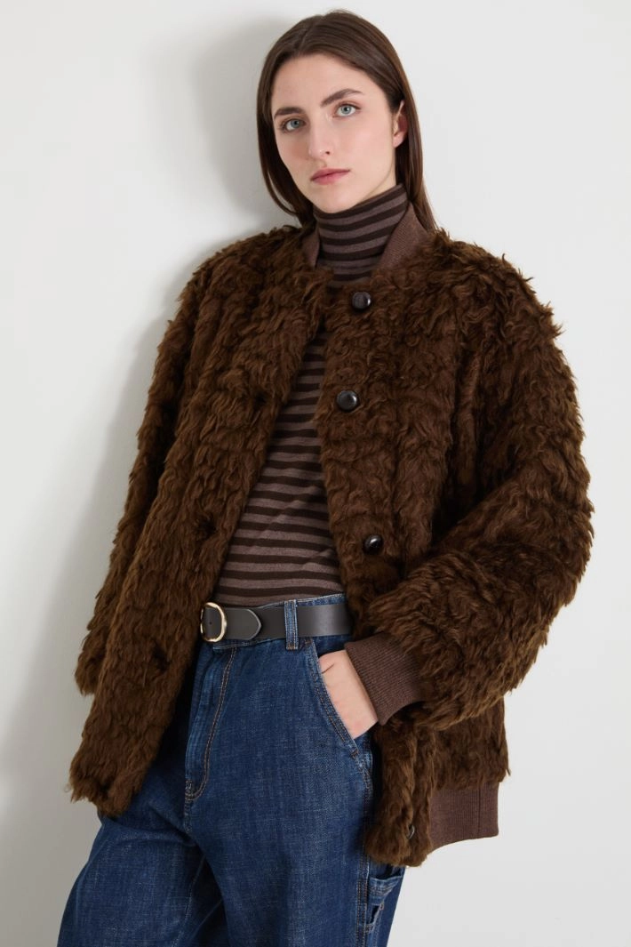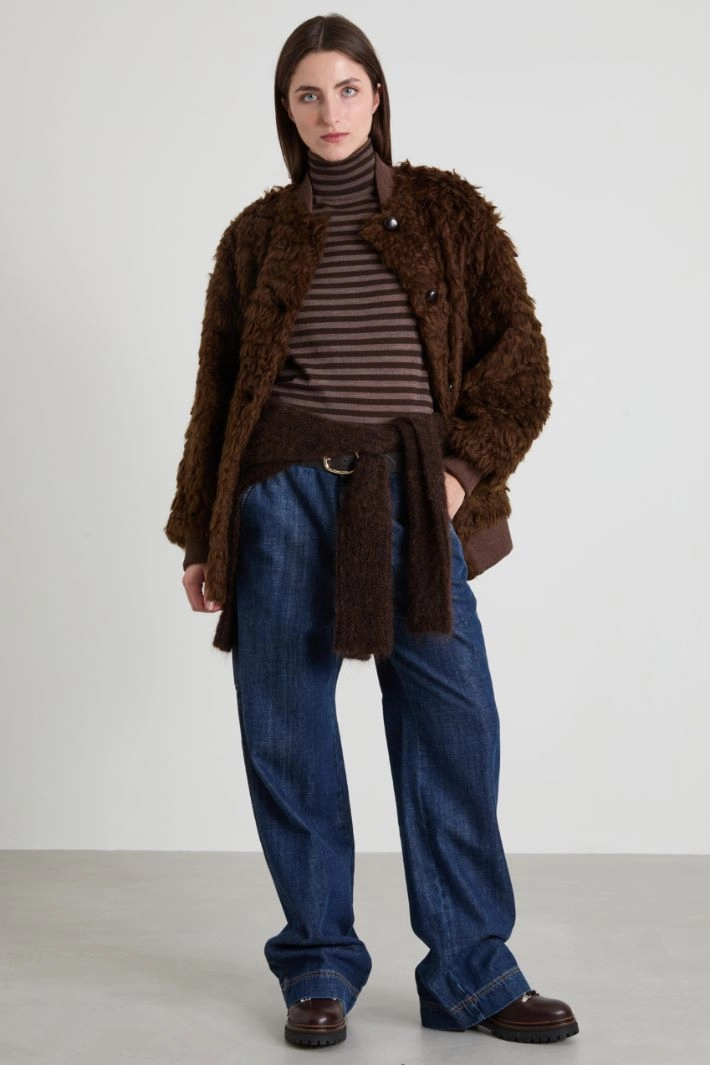 Loose-fit bomber jacket in plush jersey, with ribbed knit details, stand-up collar, long dropped sleeves and single-breasted fastening with interwoven buttons. Lined.