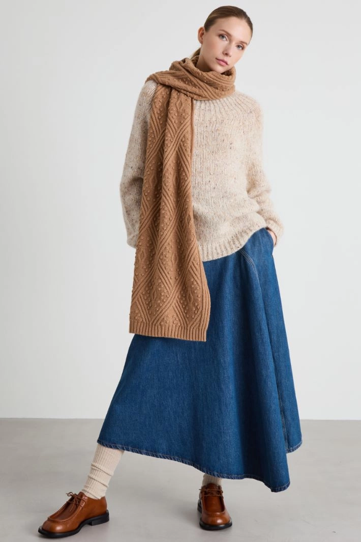 Asymmetrical midi skirt in pure cotton denim, with a stitched cut motif on the front, inset side pockets and fastening with a hidden zip and metal button.