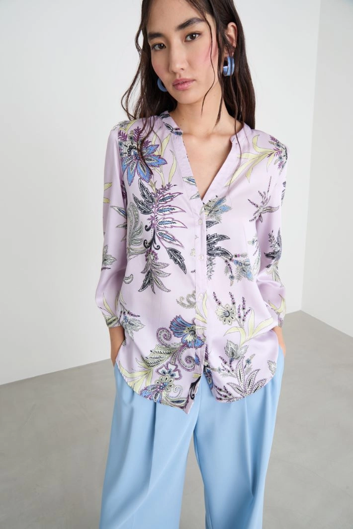 A loose-fit blouse in printed twill, featuring a split round neckline, three-quarter length sleeves and a front button fastening.