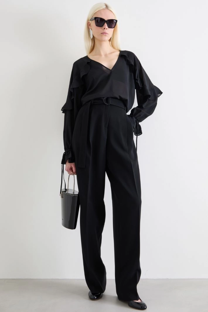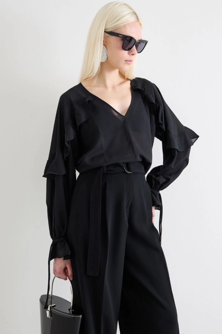 Straight-cut blouse in georgette with ruffled detail, V-neck and long raglan sleeves with cuff and drawstring.