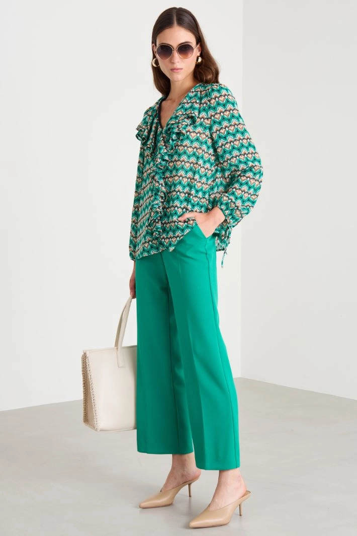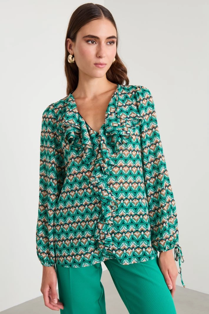 Flowing blouse in all-over printed plumetis georgette, with ruffled detail on the V-neck and front, and long sleeves with ties at the wrist.