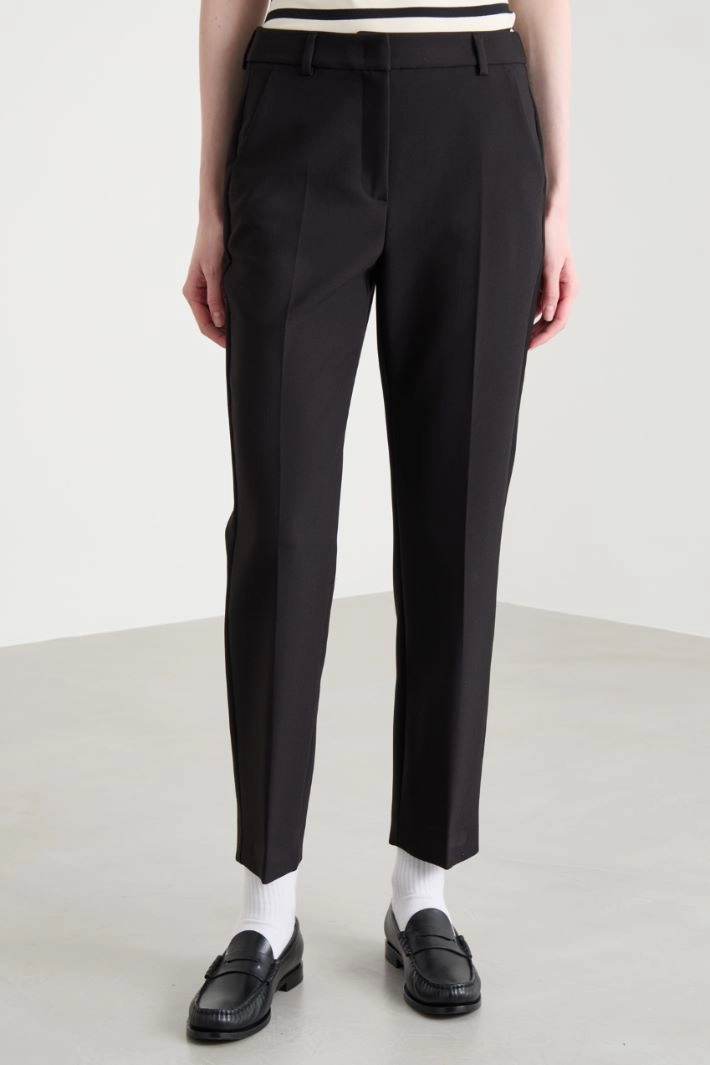 Straight-fit trousers in stretch viscose double cloth, with a pressed centre crease, belt loops, French pockets at the front, and buttoned double-welt pockets at the back. Concealed zip and hook fastening.