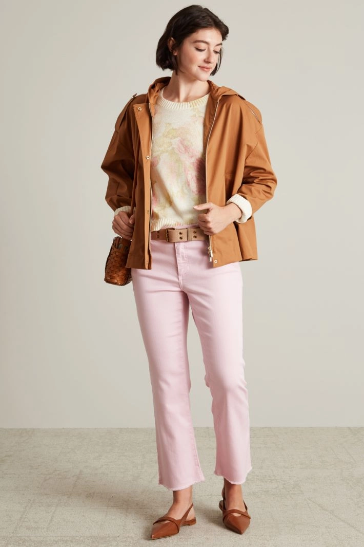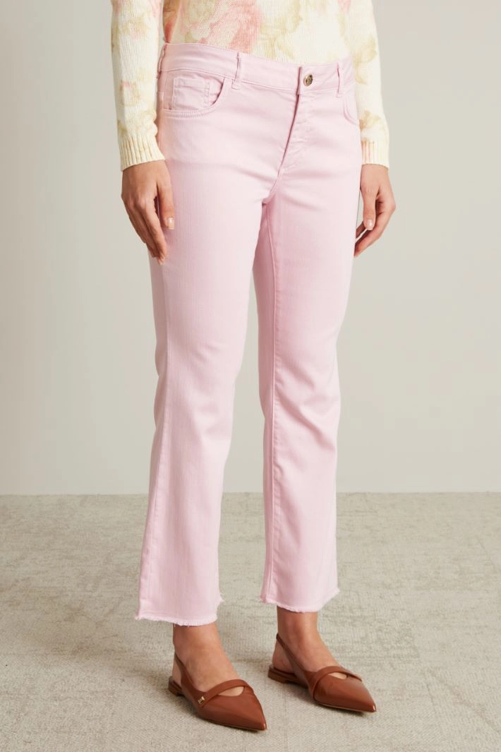 Slightly flared trousers in blend of natural fibre and stretch cotton gabardine, with belt loops at the waist, five pockets, frayed hem and concealed zip and button fastening.
