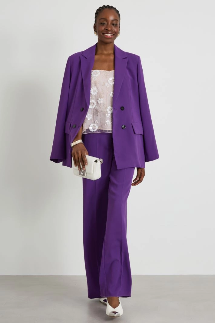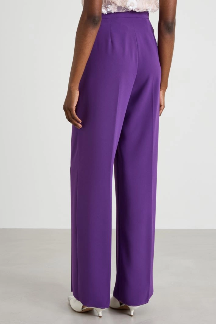 Palazzo trousers in envers satin, with French pockets and pressed crease along the length. Hidden fastening with zip, button and hooks.
