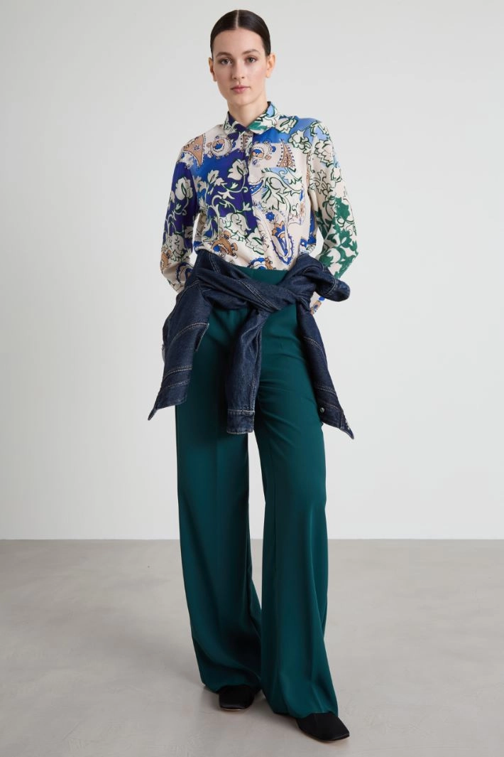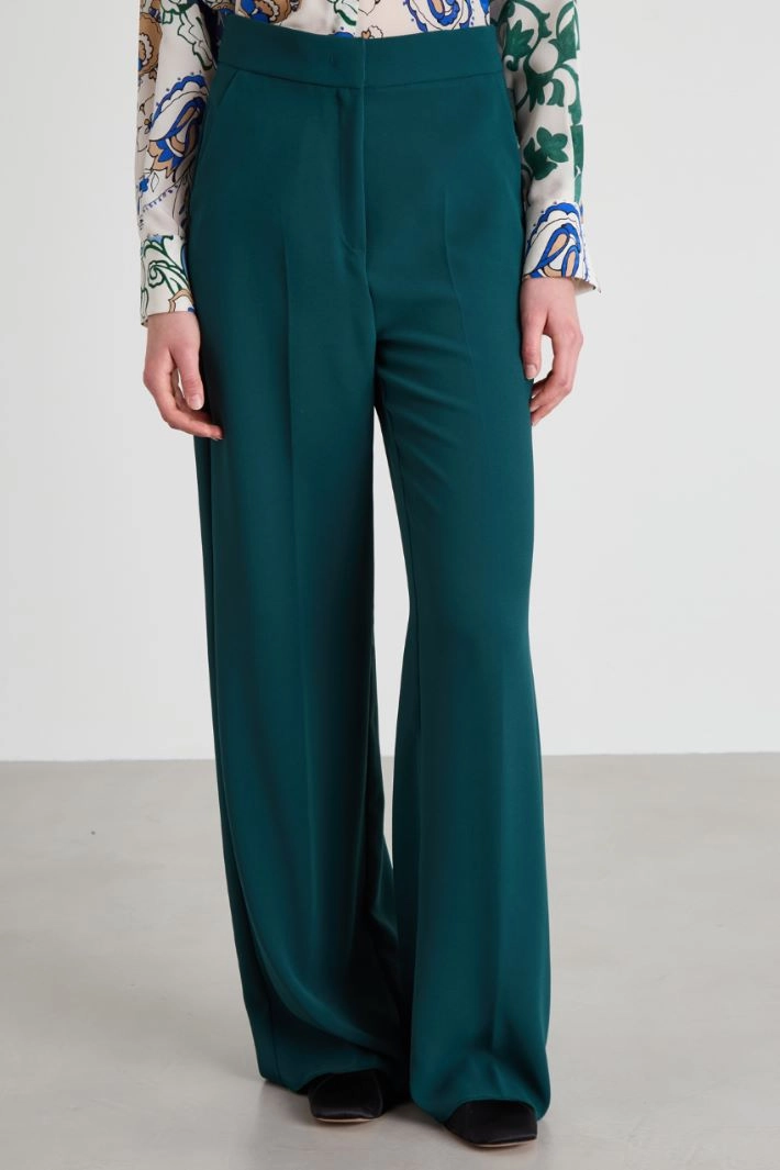 Palazzo trousers in envers satin, with French pockets and pressed crease along the length. Hidden fastening with zip, button and hooks.