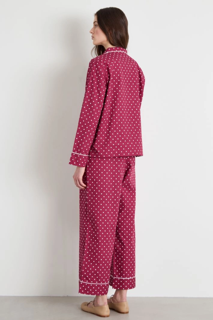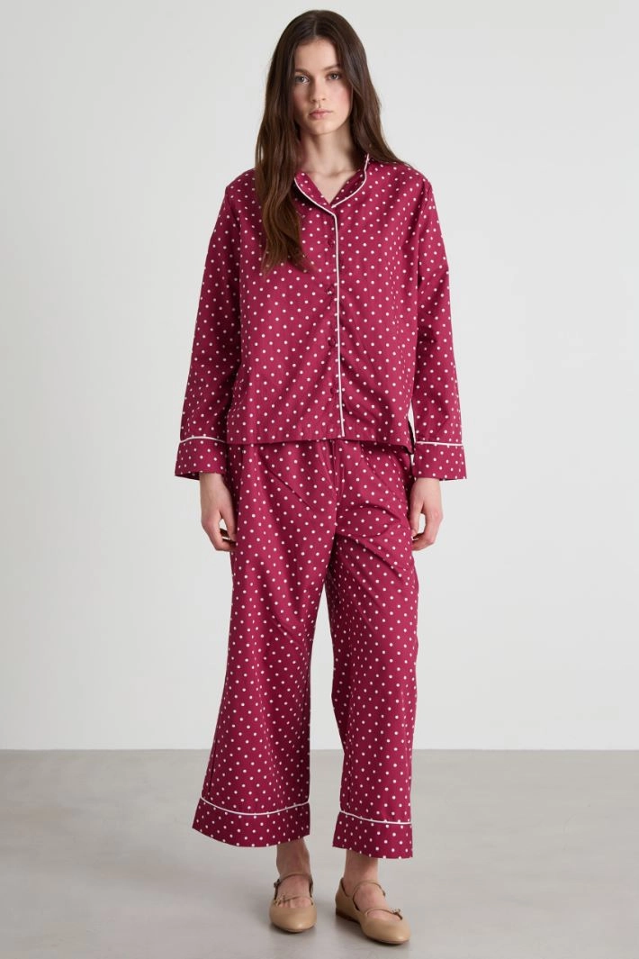 Pyjamas in printed pure cotton satin. Straight-cut shirt with lapel collar, long sleeves and button fastening. Straight-cut trousers with elastic waistband.