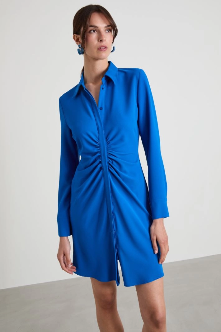 Regular-fit shirt dress in flowing fabric, featuring a shirt collar, long sleeves with buttoned cuffs, and a gathered detail along the front waist. Concealed button fastening.