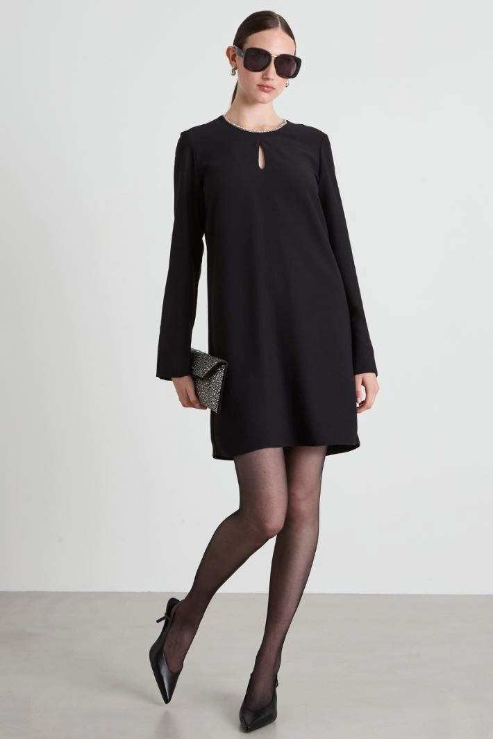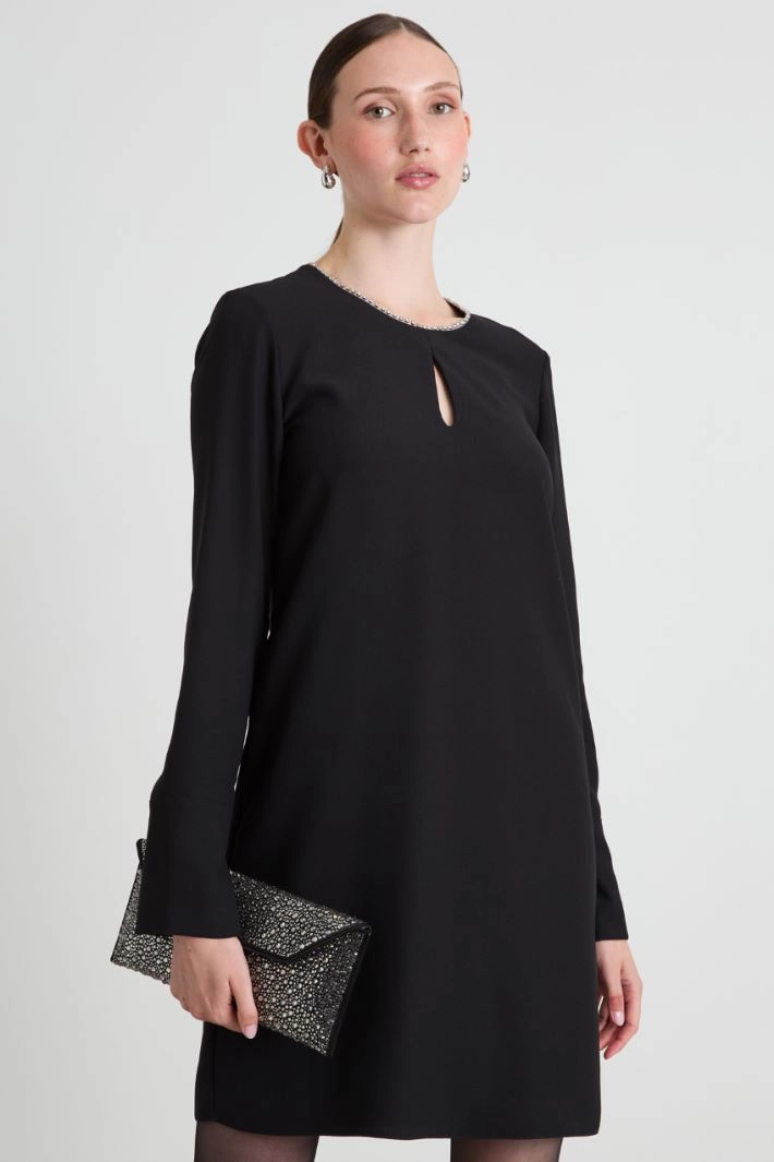 Flared dress in crepé fabric, with a round neckline embellished with embroidered crystals and a teardrop opening, long sleeves with high cuffs and a slit. Fastening with an invisible zip.