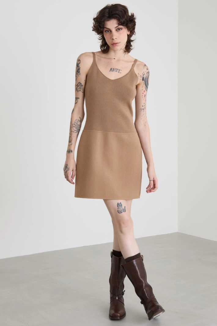 Short bimaterial dress with a semi-fitted line in pure wool. Knitted bodice, with a V-neck, thin shoulder straps and a double fabric skirt. Invisible zip fastening on the back.