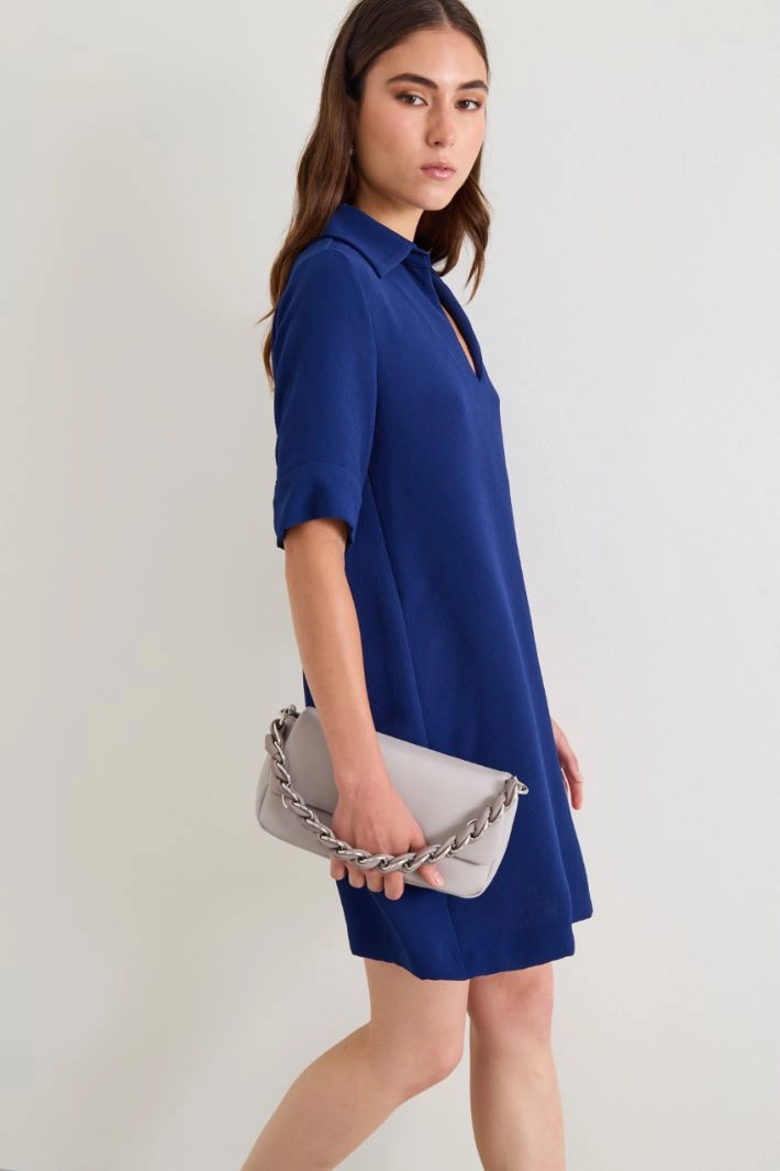 Straight-cut dress in flowing textured fabric, with shirt collar, V-neck and elbow-length sleeves with slit.
