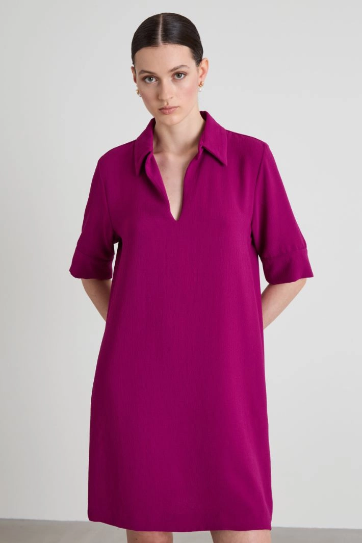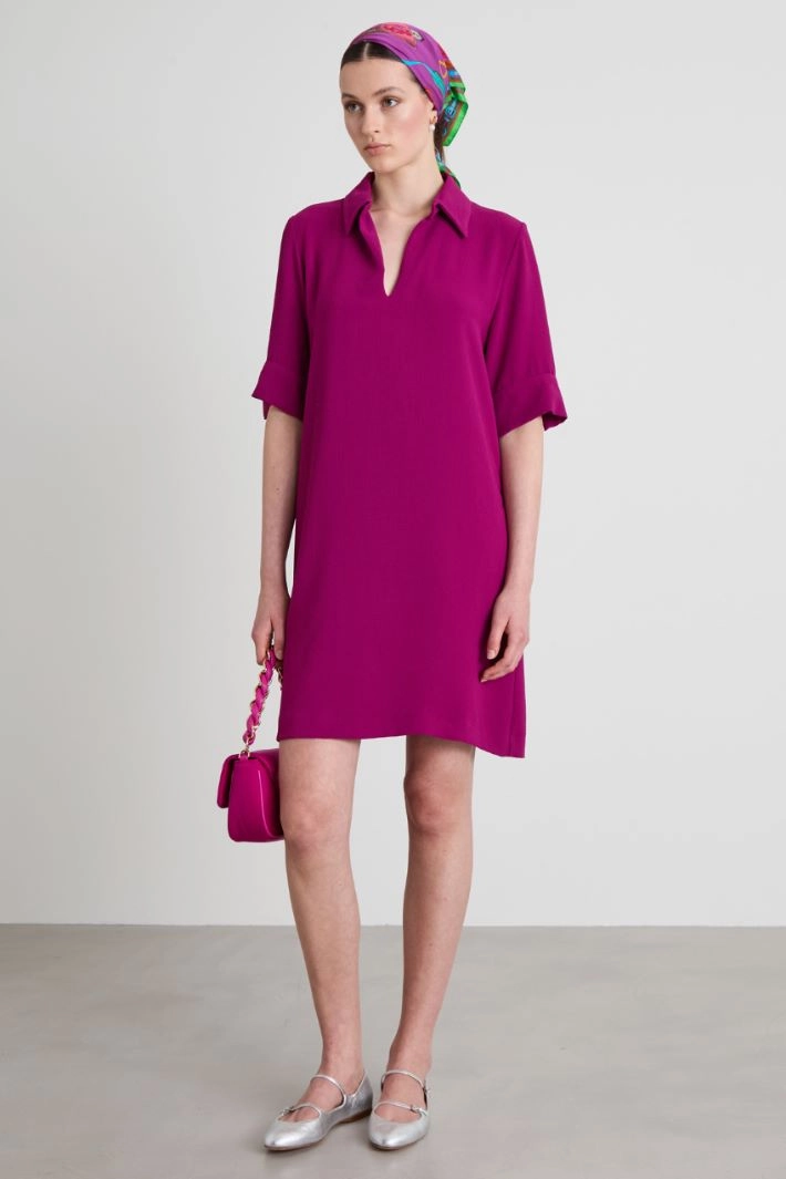 Straight-cut dress in flowing textured fabric, with shirt collar, V-neck and elbow-length sleeves with slit.