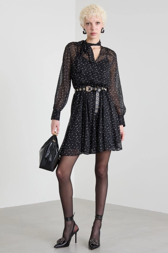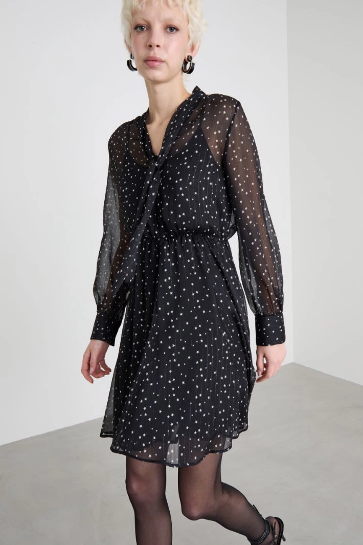 Short flared dress in printed lamé crepon with a scarf collar and V-neckline, long sleeves with cuffs and buttons, and an elastic waistband. Matching slip.