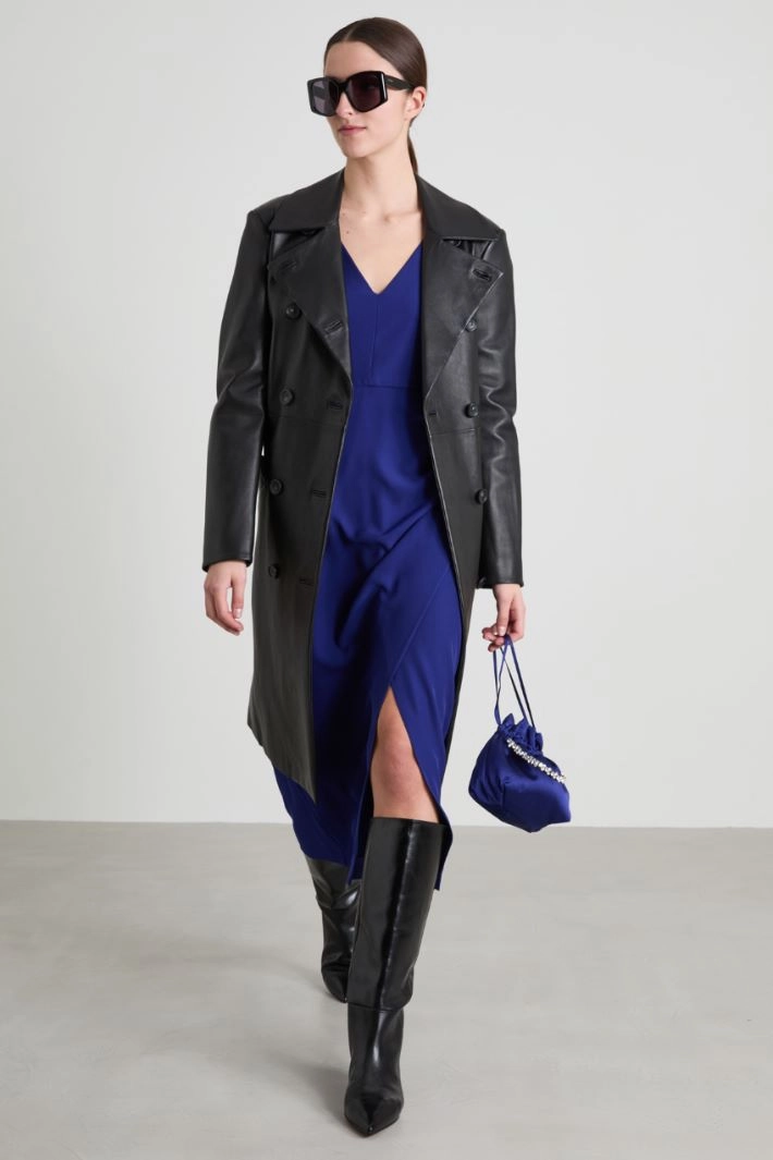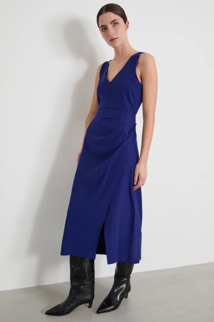 Sheath dress in flowing fabric, with a V-neck, cut at the waist and a wrap skirt with side pleats. Invisible zip fastening on the center back.