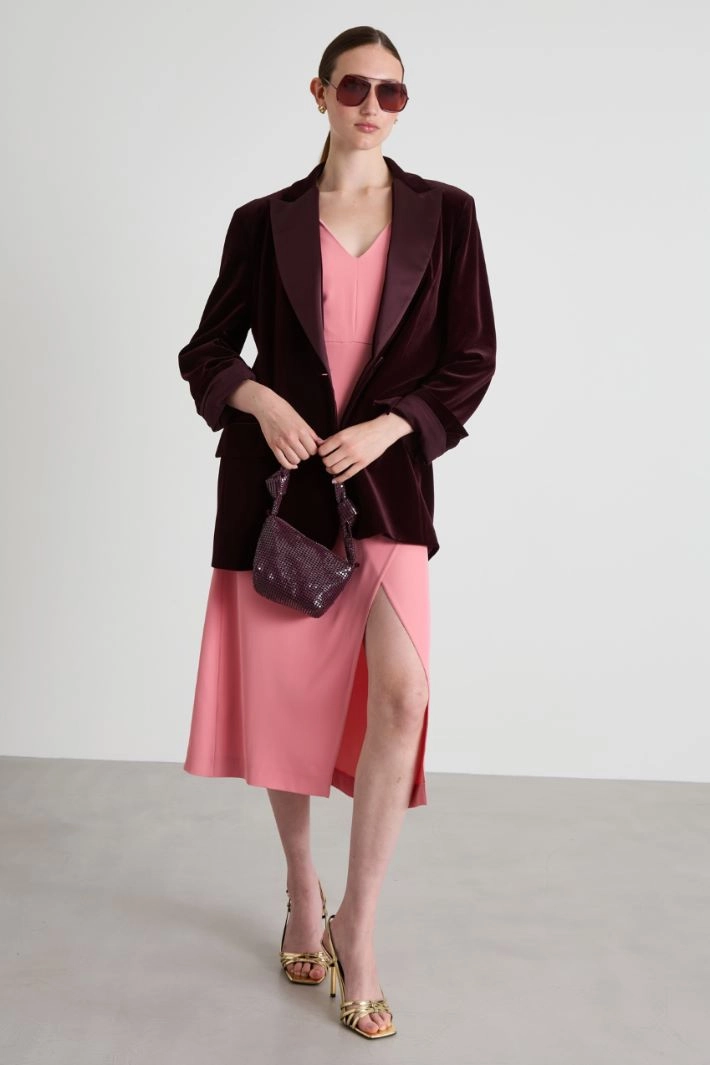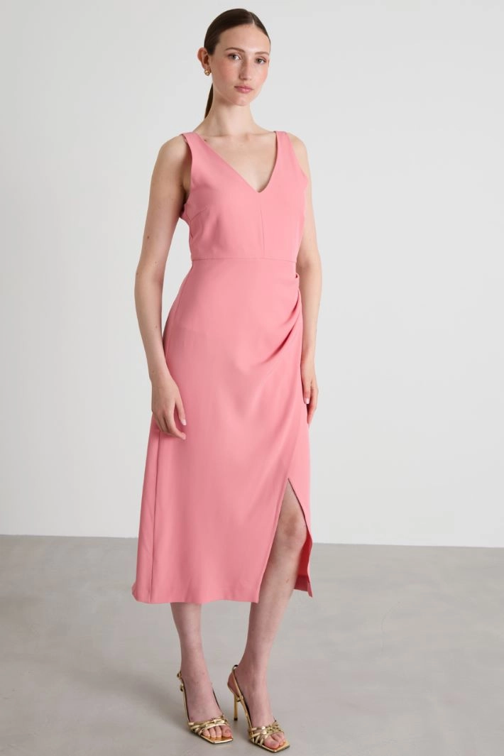 Sheath dress in flowing fabric, with a V-neck, cut at the waist and a wrap skirt with side pleats. Invisible zip fastening on the center back.