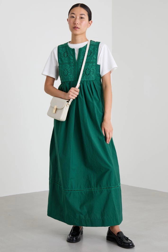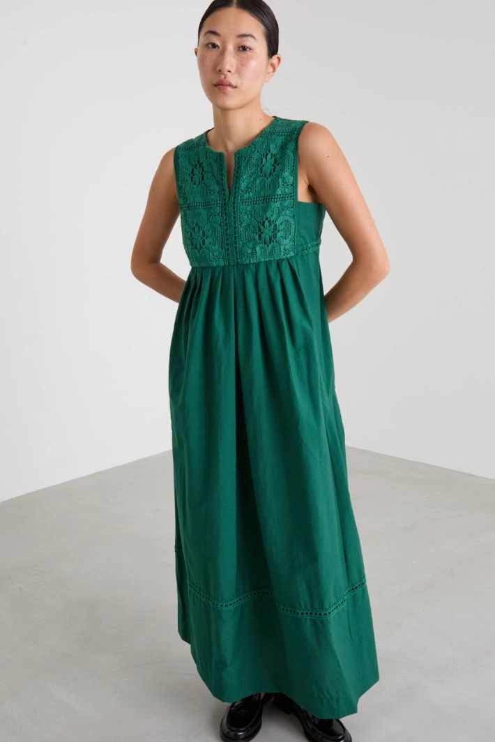Flared dress in cotton blend canvas, with matching embroidered motifs, round neckline with V-neckline, sleeveless and invisible zip fastening on the back. Semi-lined.