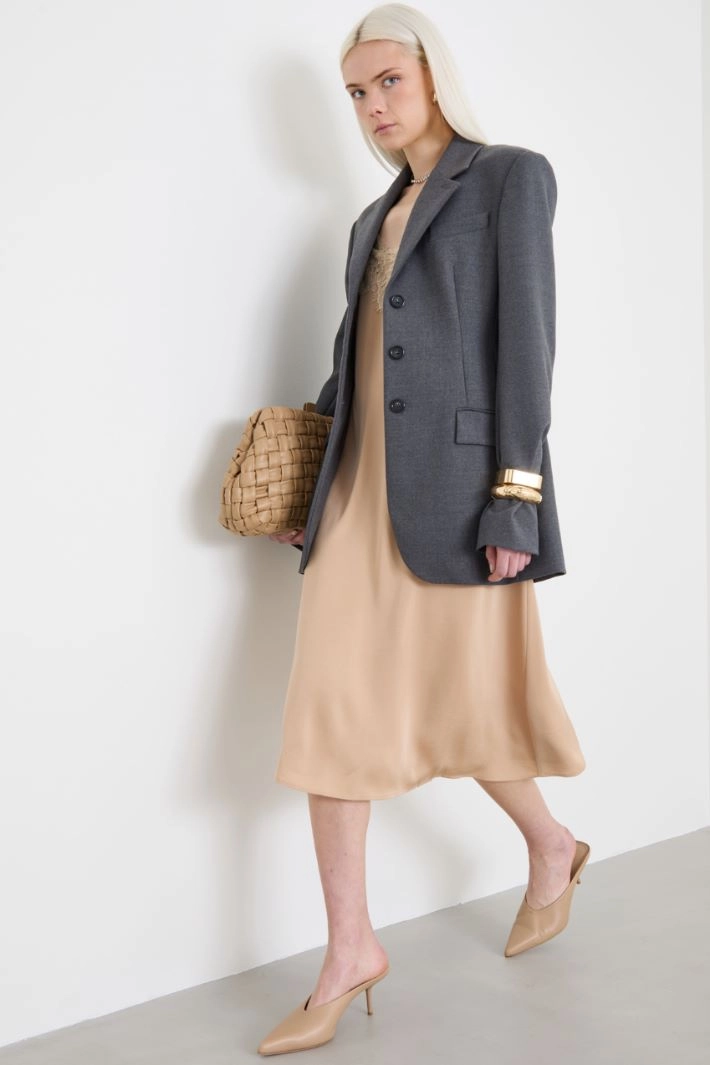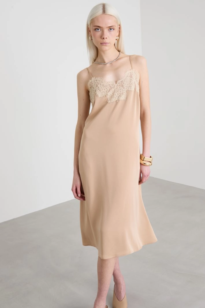 Slip dress in cotton blend satin, with a V-neckline embellished with a lace motif, thin adjustable straps and inset side pockets. Lined.