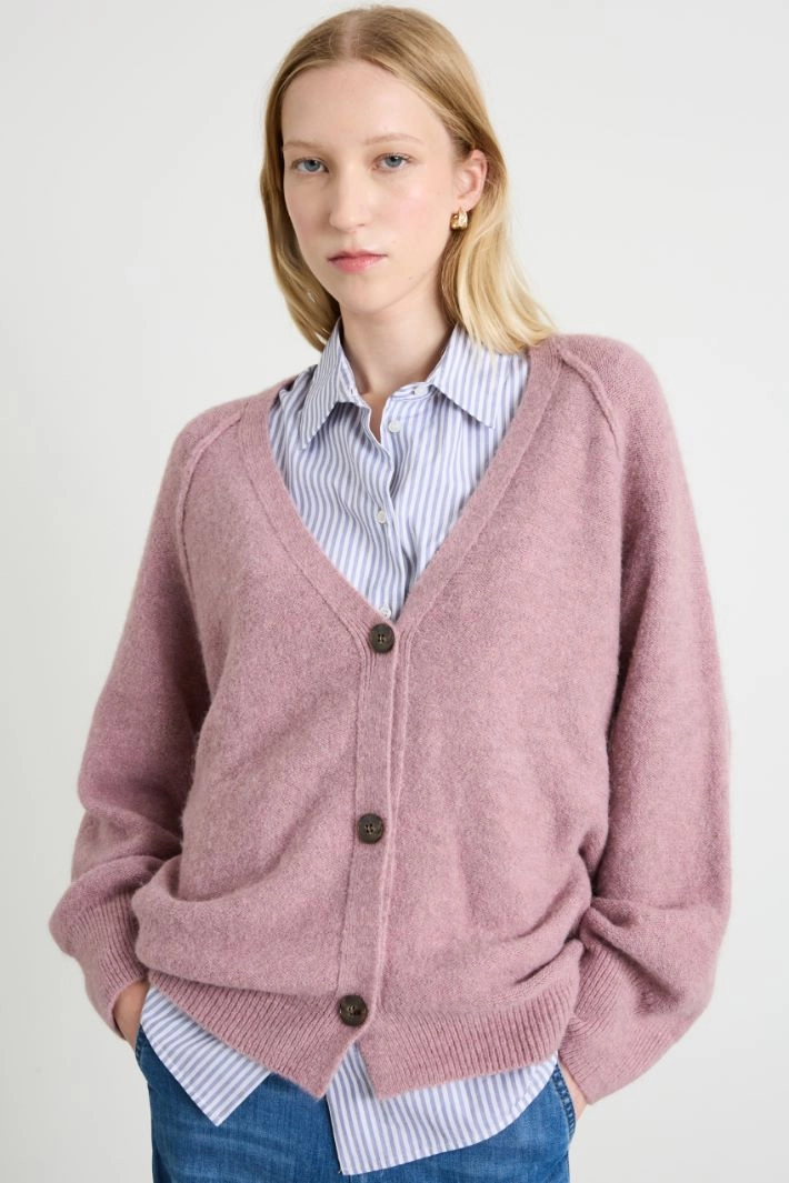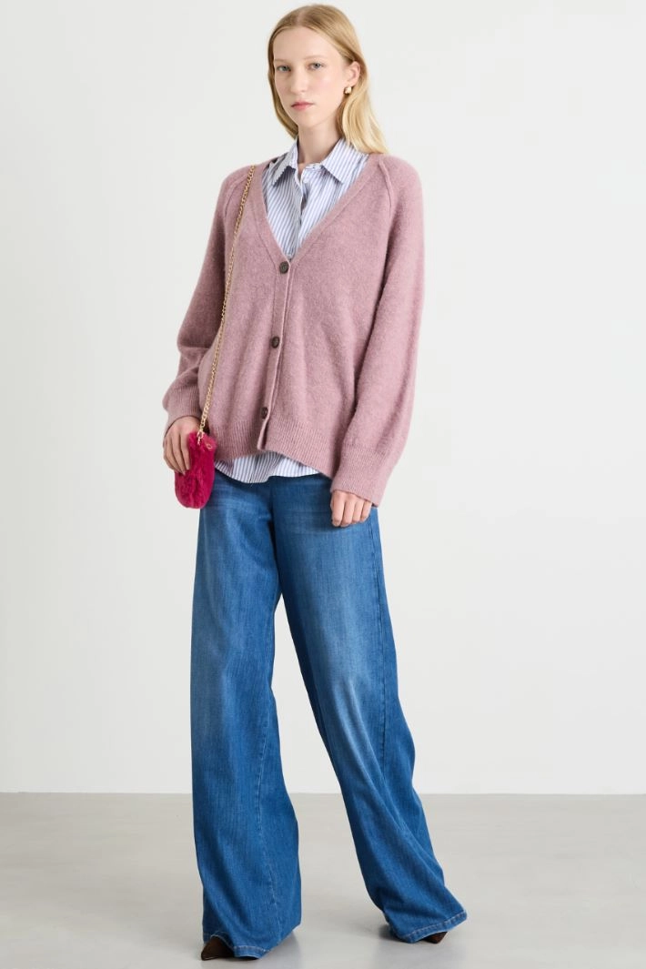 Regular-fit cardigan in viscose and wool blend yarn, with a V-neck, long sleeves, ribbed trims and button fastening.