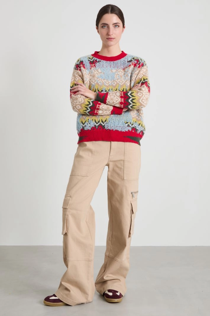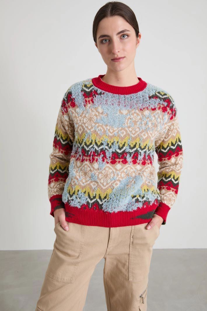 Regular-fit sweater in jacquard wool blend yarn, with crew neck and long low-set sleeves.
