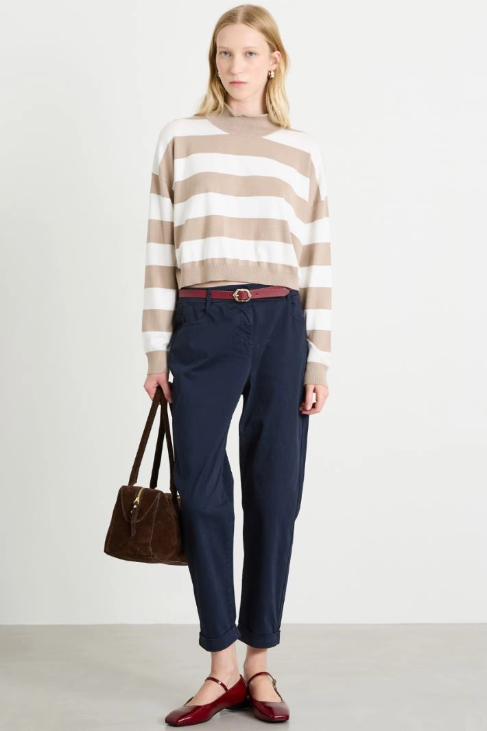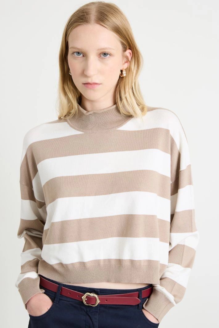 Suéter corto de corte boxy realizado en hilo mezcla de viscosa, con cuello tipo cráter, mangas largas caídas y ribetes de canalé.
