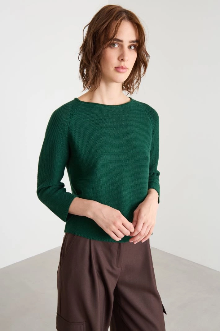 Loose-fit sweater in pure cotton, with boat neckline and 3/4 raglan sleeves.