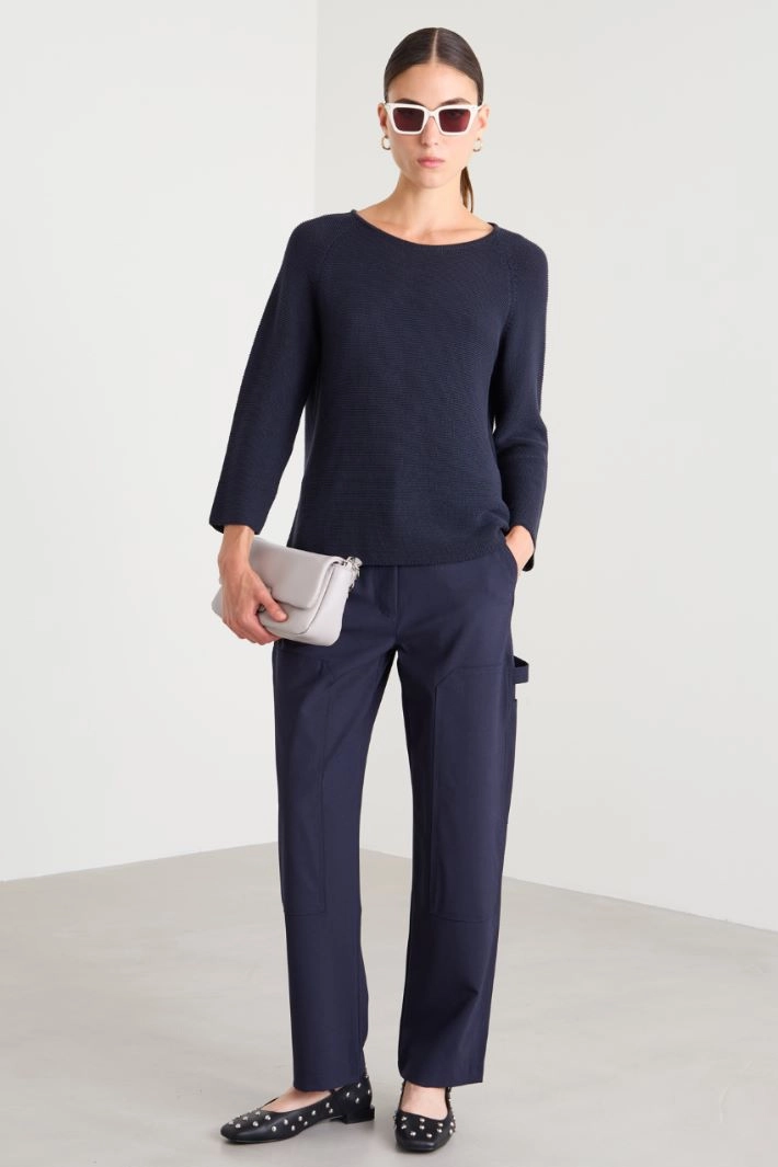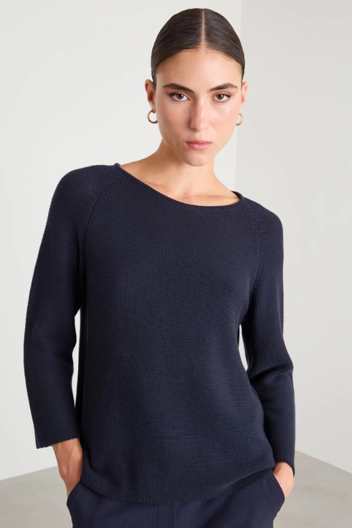 Loose-fit sweater in pure cotton, with boat neckline and 3/4 raglan sleeves.
