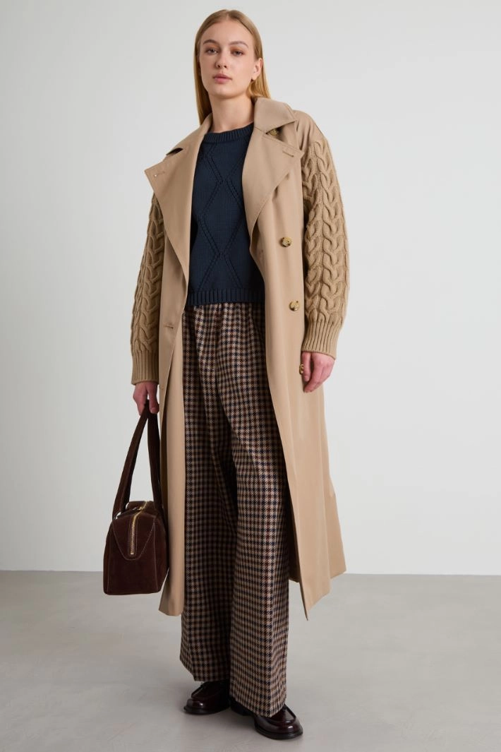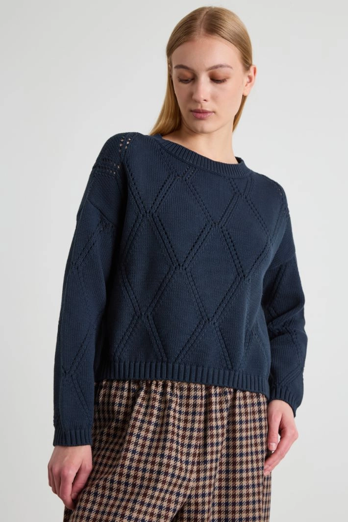 Straight-cut sweater in cotton blend yarn, with diamond-shaped openwork, round neckline, long dropped sleeves and asymmetrical hem that is longer at the back. Ribbed trim.