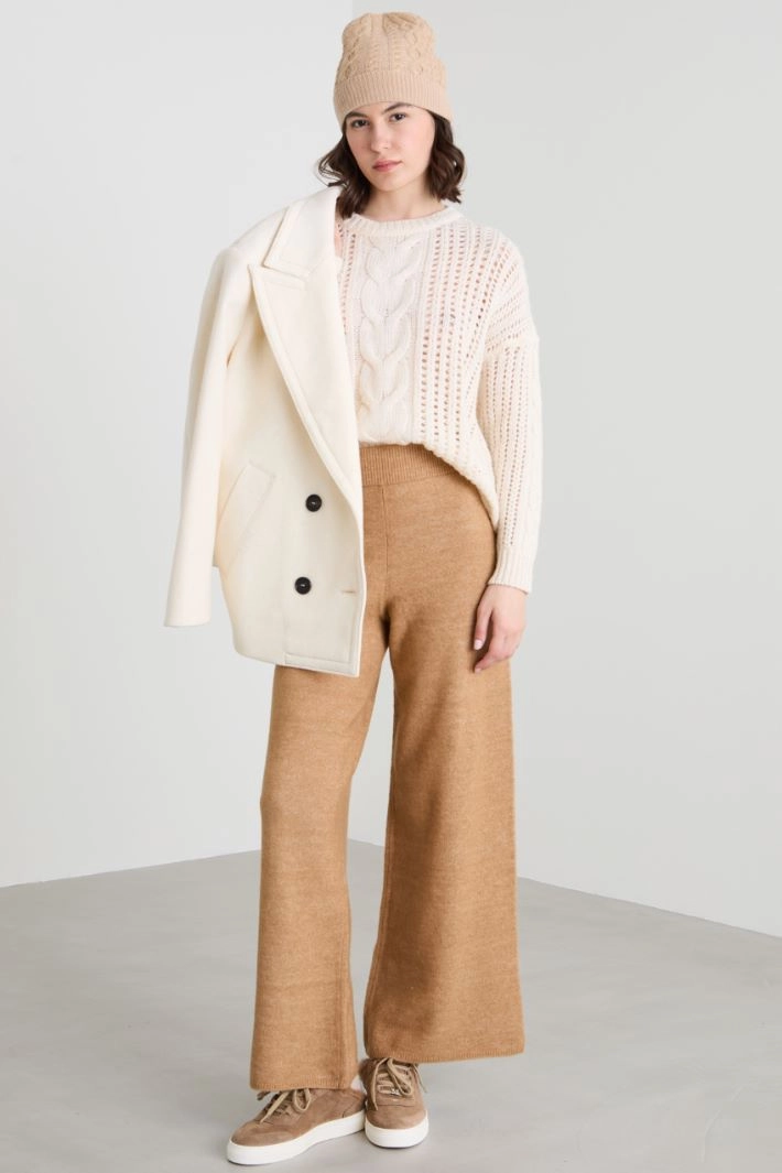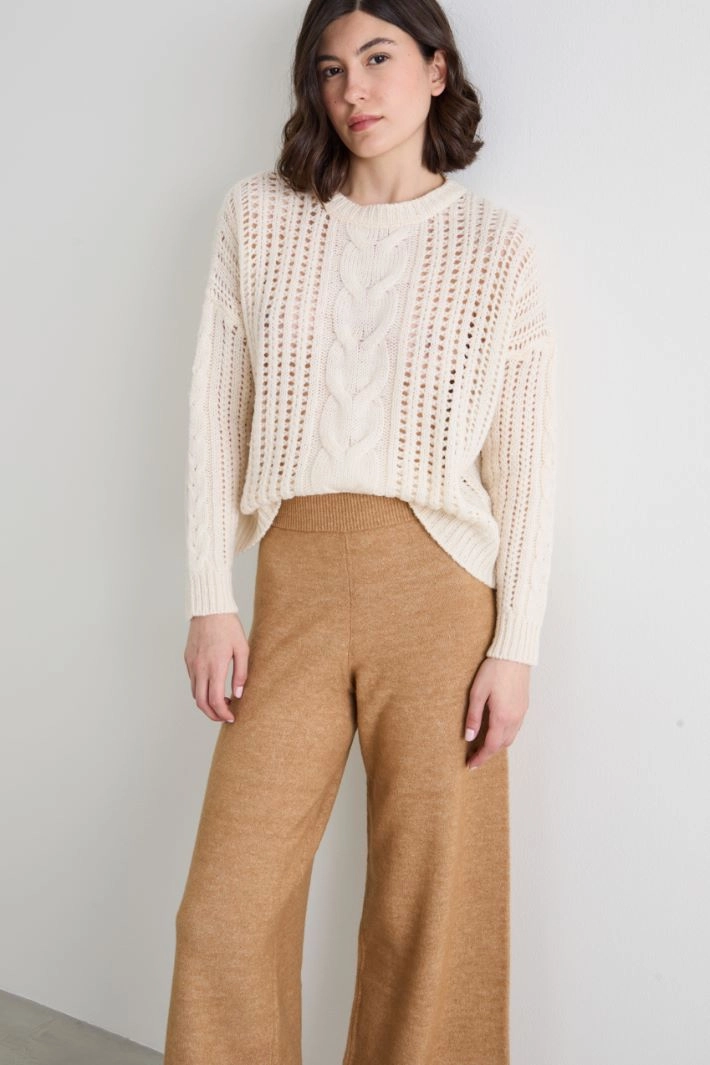 Loose-fit sweater in wool yarn with cable knit on the front and openwork details, round neckline and long sleeves.