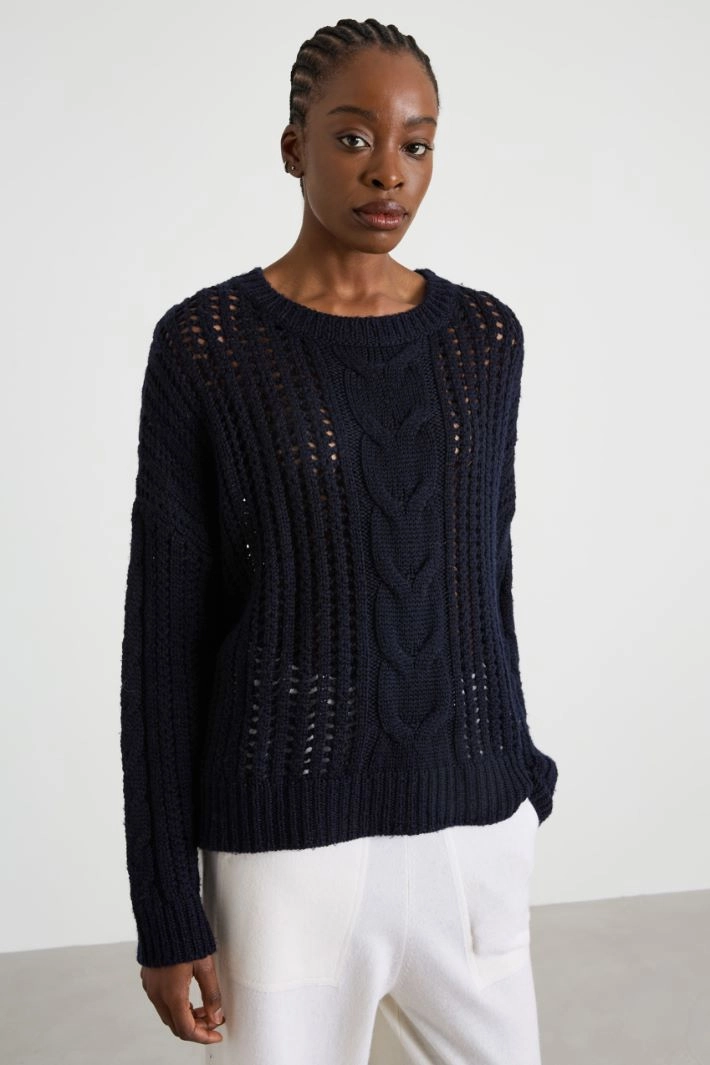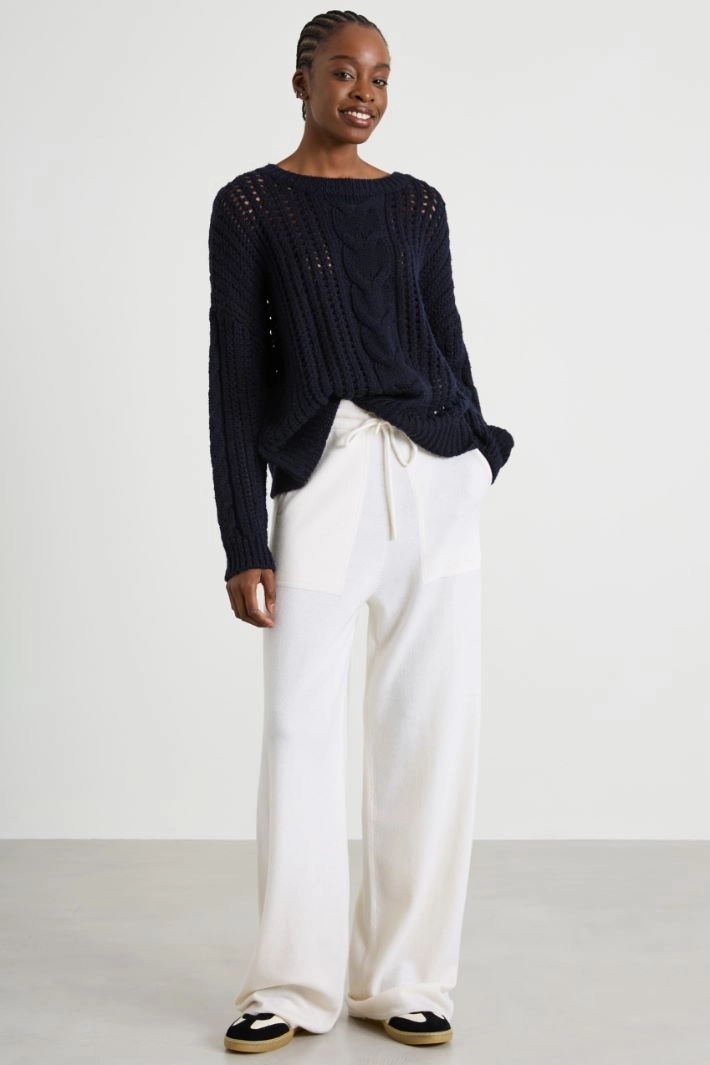 Loose-fit sweater in wool yarn with cable knit on the front and openwork details, round neckline and long sleeves.